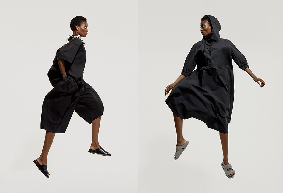 系列中还有与鞋子配套的衣服和配饰,整体在流畅的轮廓下融入雕塑的形式。均使用百搭的黑、白、灰等颜色,十分简约百搭。