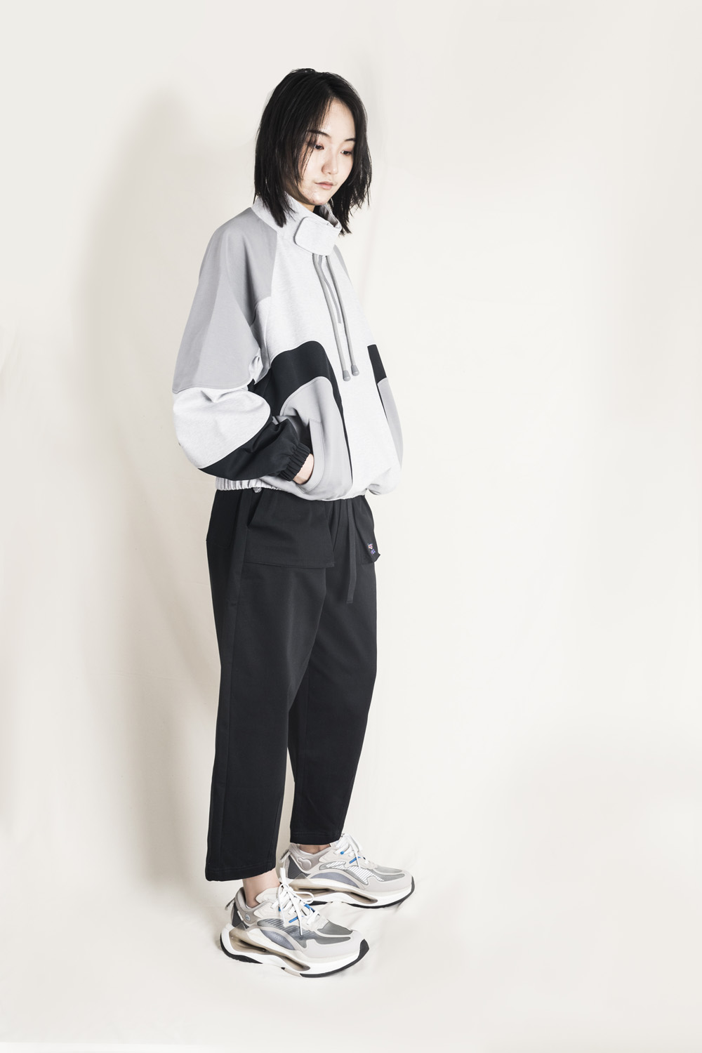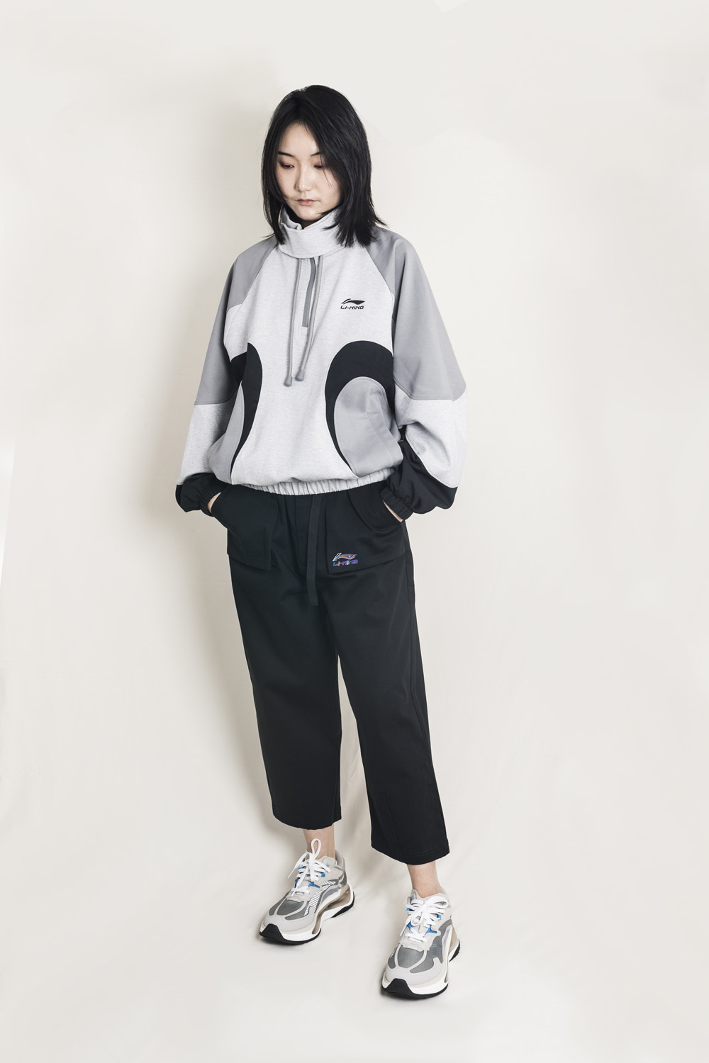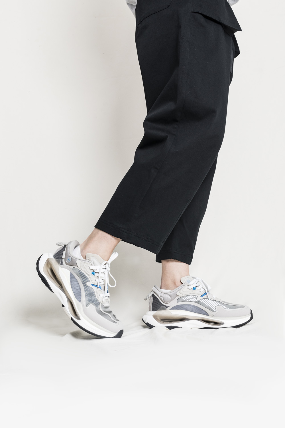 穿搭方面小编选择了李宁的黑色长裤和灰长袖进行搭配,休闲的同时又不失运动气息,小编认为它应该算是最适合春夏穿的复古老爹鞋之一。