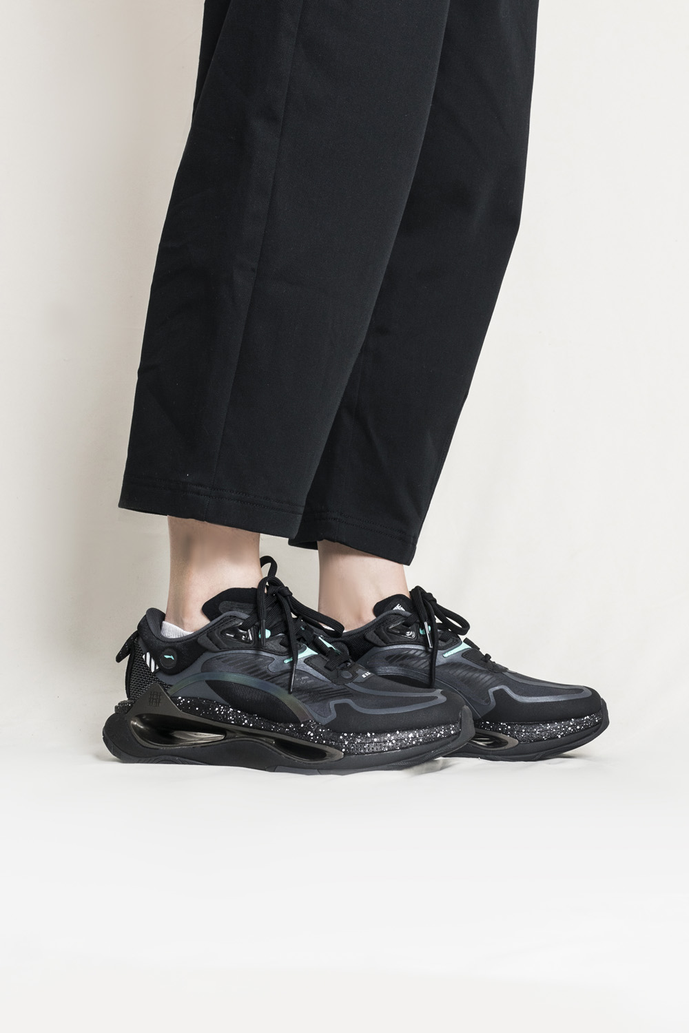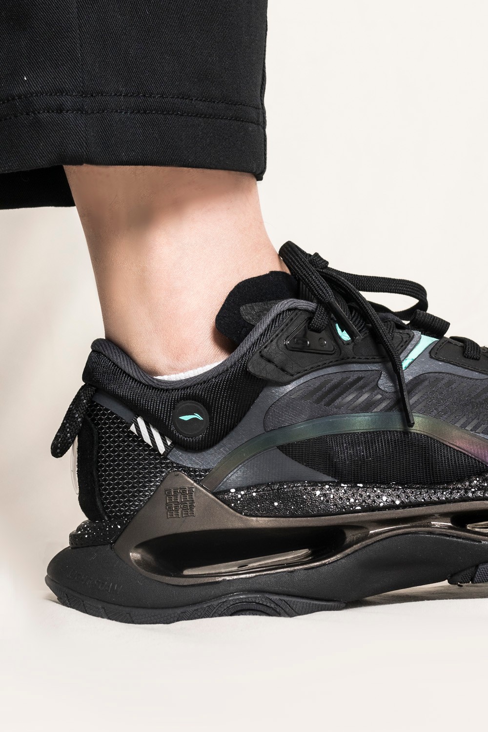 侧身部分的镂空纱网材质上标有,䨻和 LI-NING 字样,再度显示自身科技。