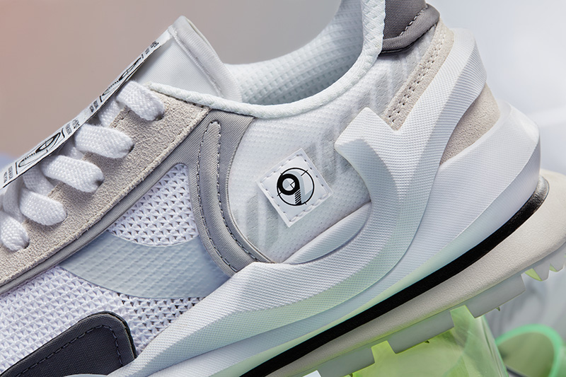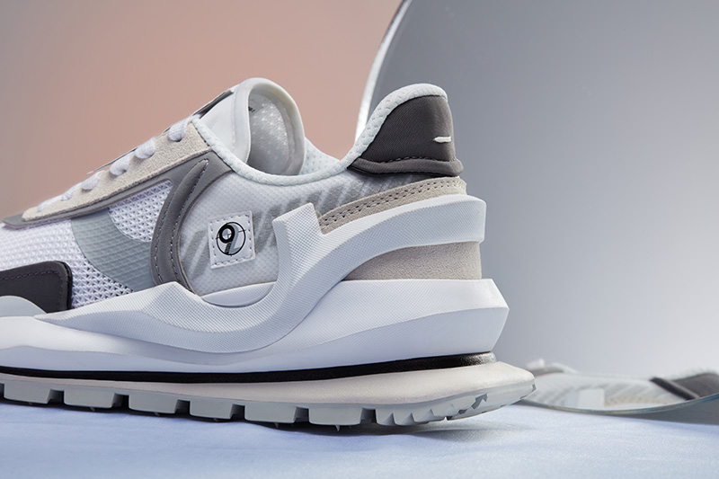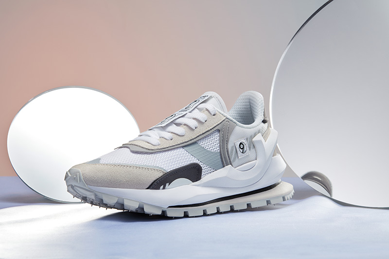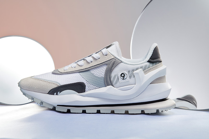 鞋侧中底向上延伸,与鞋面银灰交接,搭配多种材质构建的几何轮廓,传递方圆几何概念与东方处世哲学的相互融合。