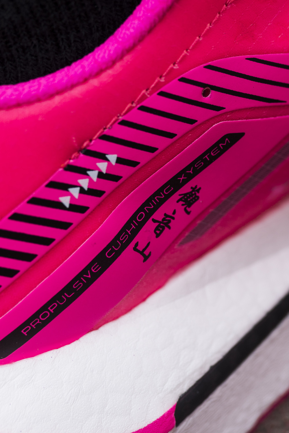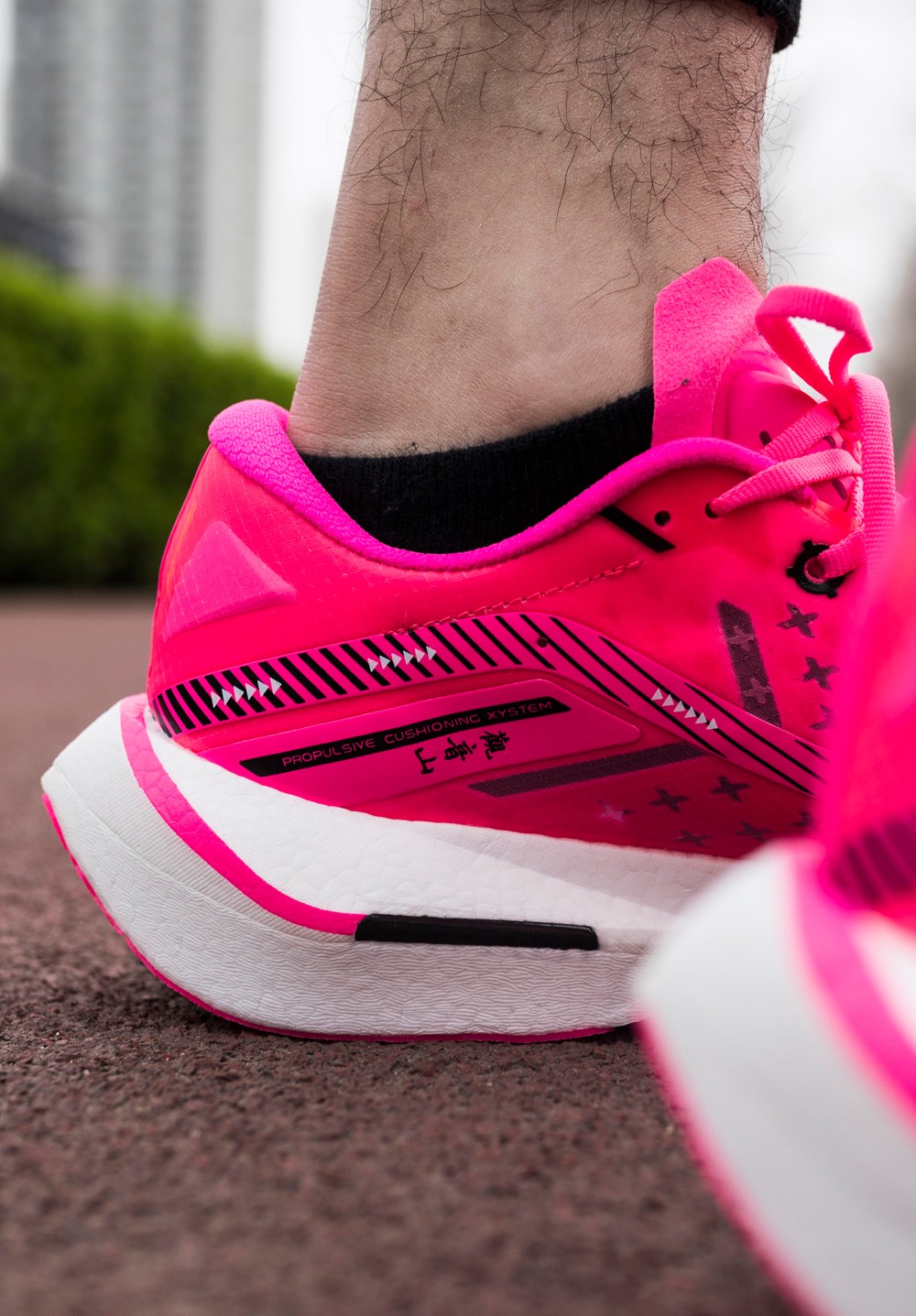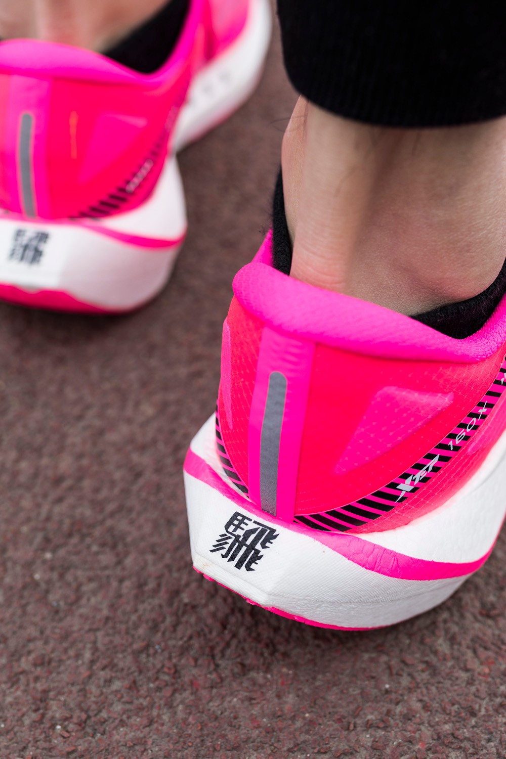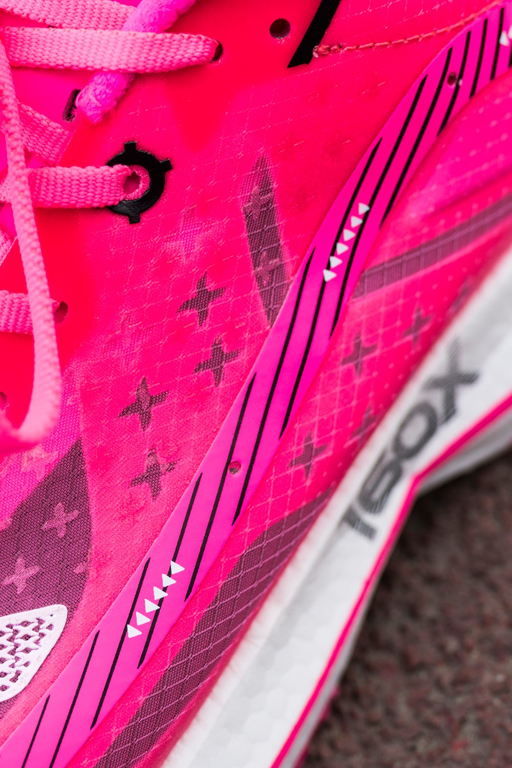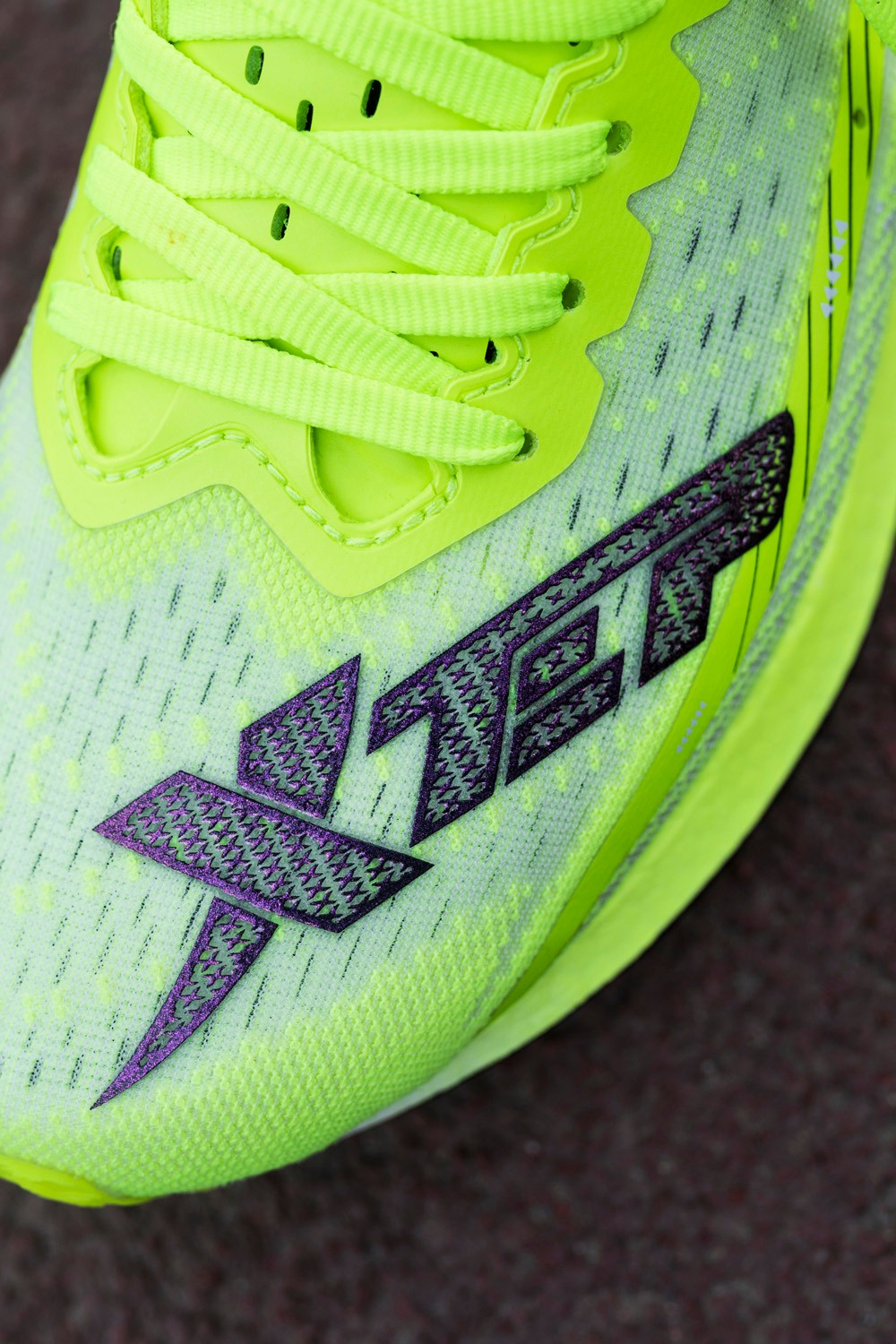 鞋身遍布竞速元素,鞋身侧面记录去年南京马拉松赛上,穿着这款鞋的运动员创造的新记录。