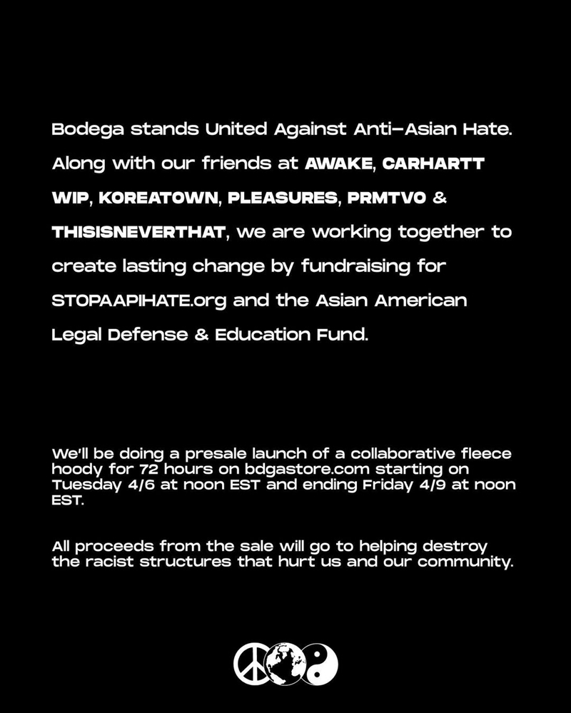 Bodega 作为其中之一,联合 PLEASURES 、Awake NY 、Carhartt WIP 、PRMTVO 、thisisneverthat 以及 KOERATOWN 六家知名潮流品牌,推出一款印有反仇恨宣传标语的帽衫,以此表达对于亚裔群体的支持。