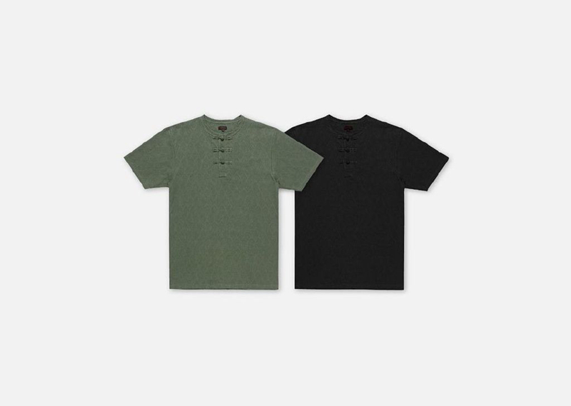 另一件 T 恤在领口处装饰唐装标志性绳结扣,配合大面积军绿及黑色,简约百搭。
