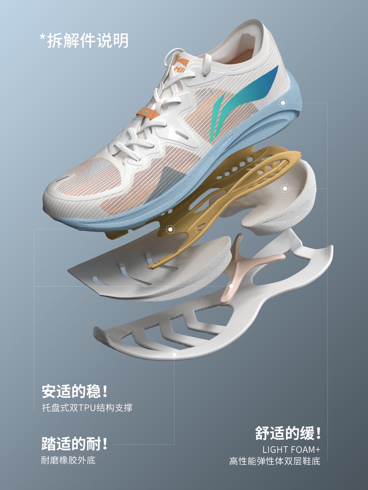 这一切都得益于李宁吾适 5S 时尚跑鞋创新的托盘式双层 TPU 设计。