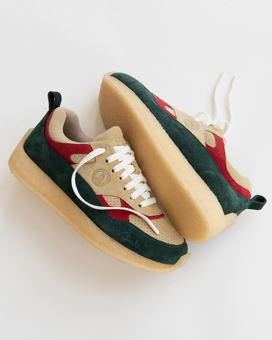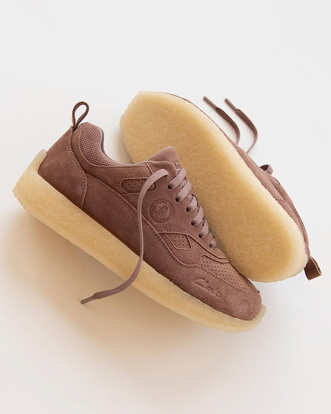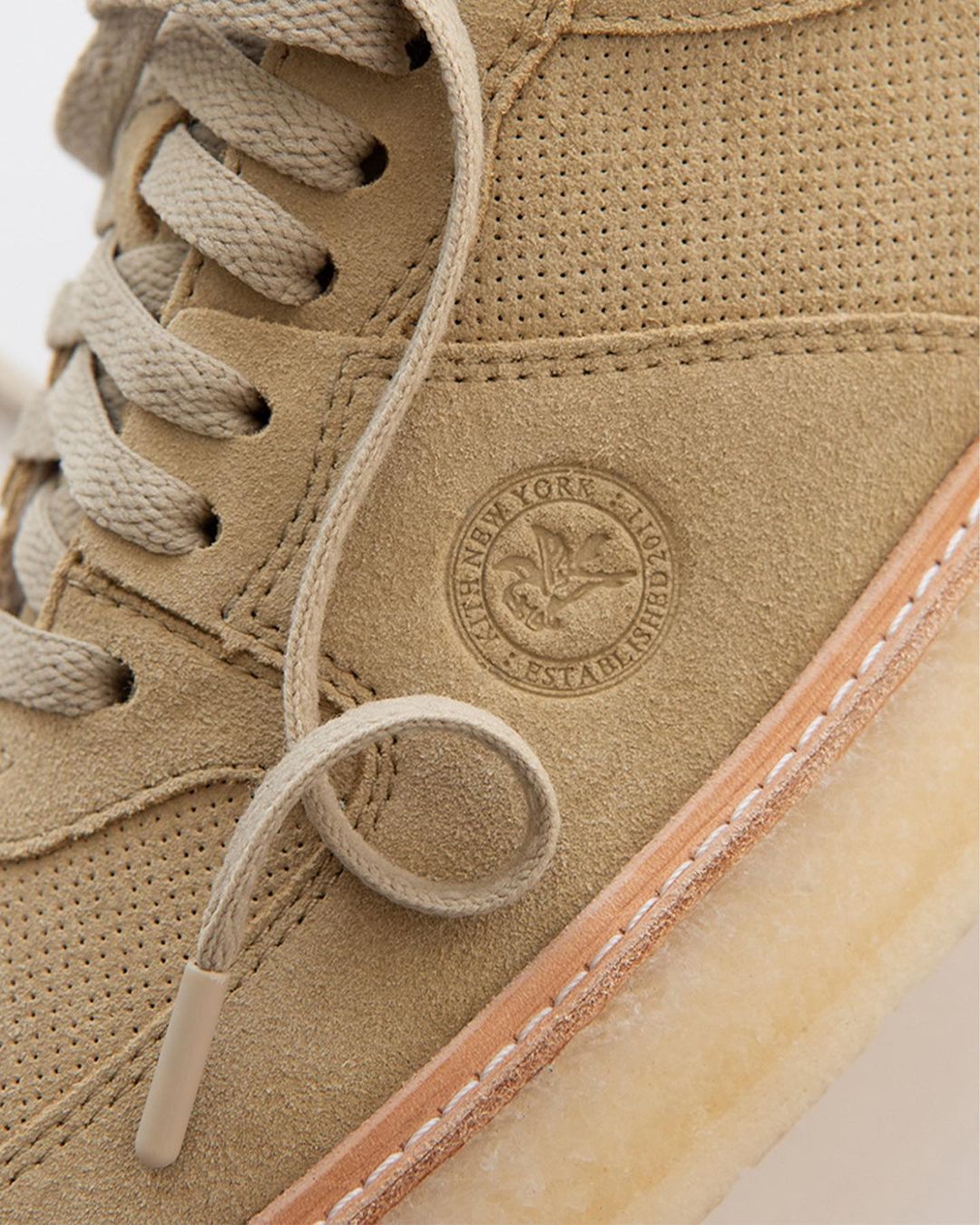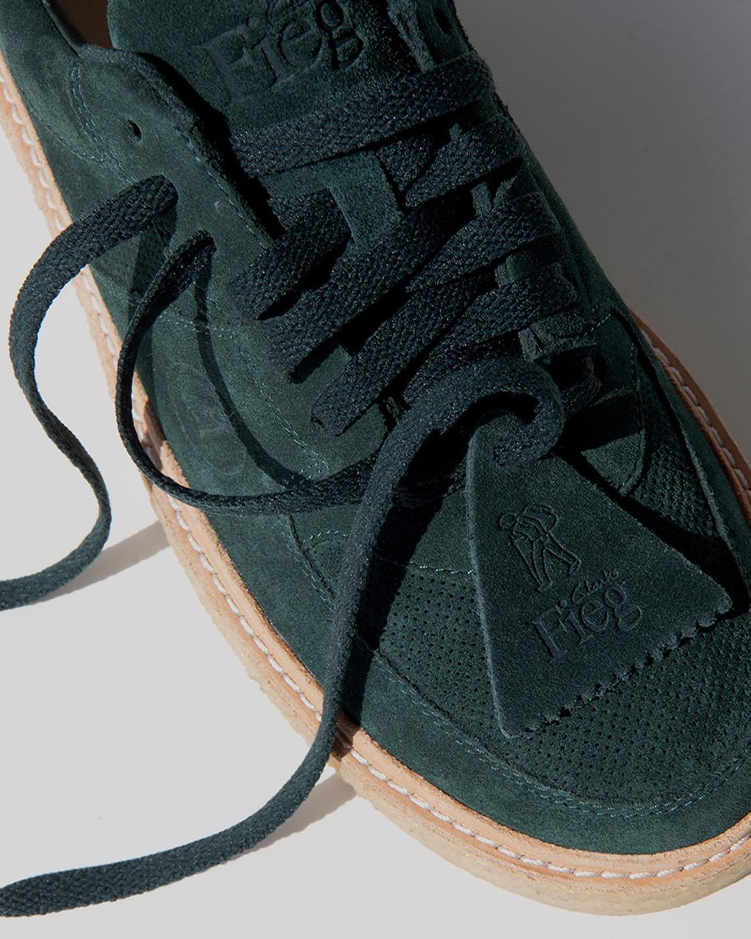 同样是全鞋身的麂皮材质,质感满满。鞋身侧面的圆形图章和鞋舌的 “Fieg Clarks” 以及鞋头侧面压印的 “Clarks” 字样彰显联名身份。