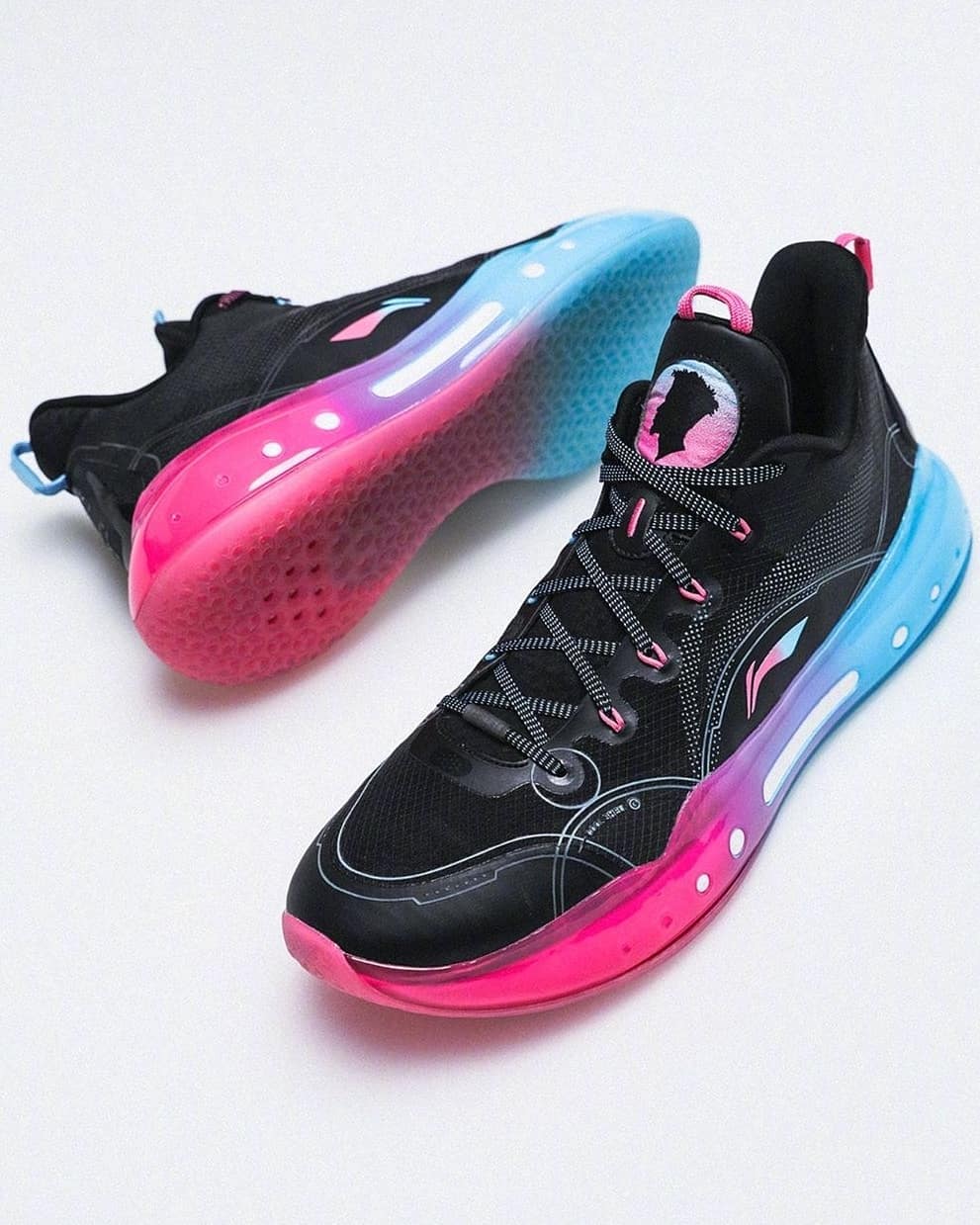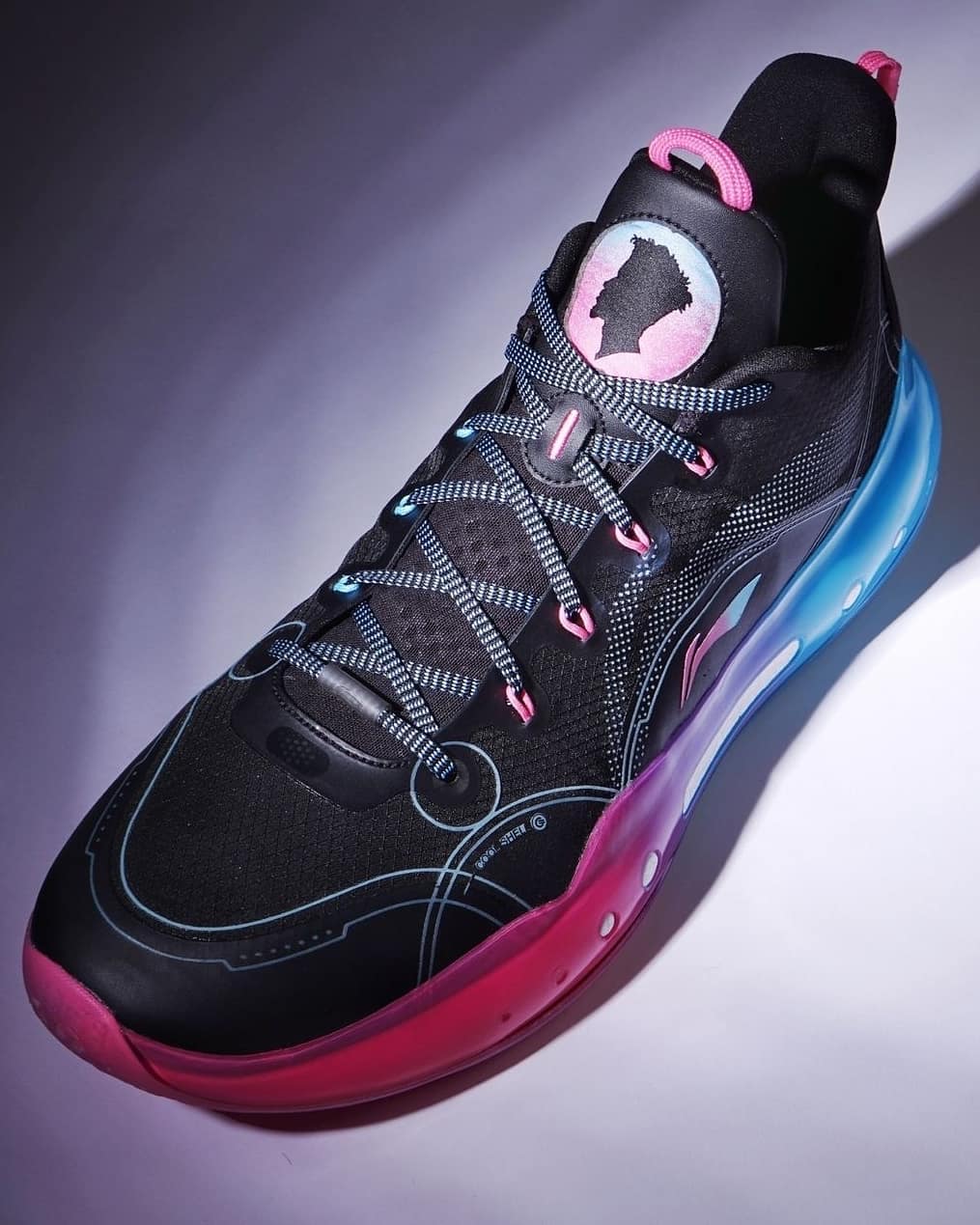 除此之外还有一双吉米·巴特勒 PE 版本的驭帅 14 䨻 Low 浮现网络,同样的红蓝渐变,只不过将白色鞋面改为纯黑装扮,视觉效果同样出彩。