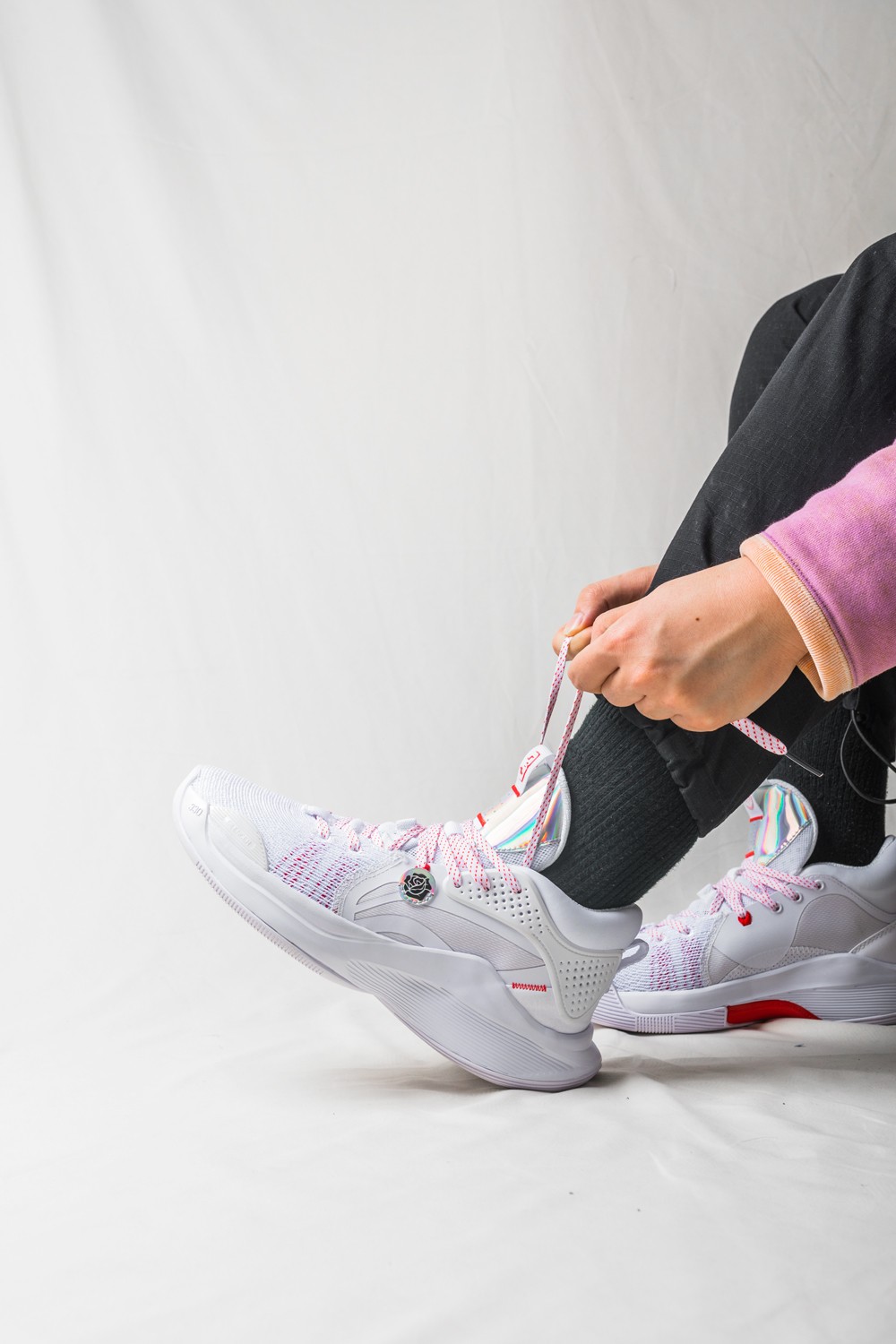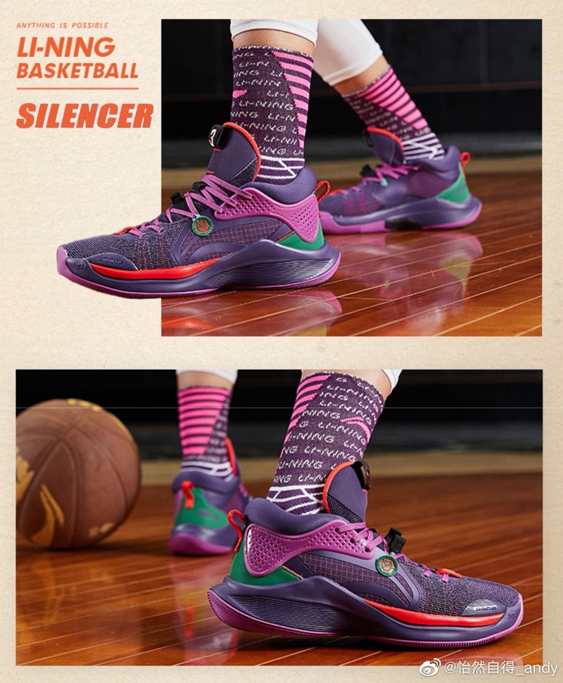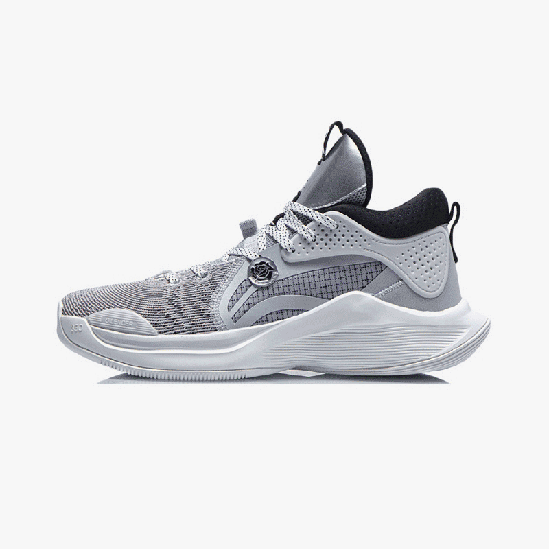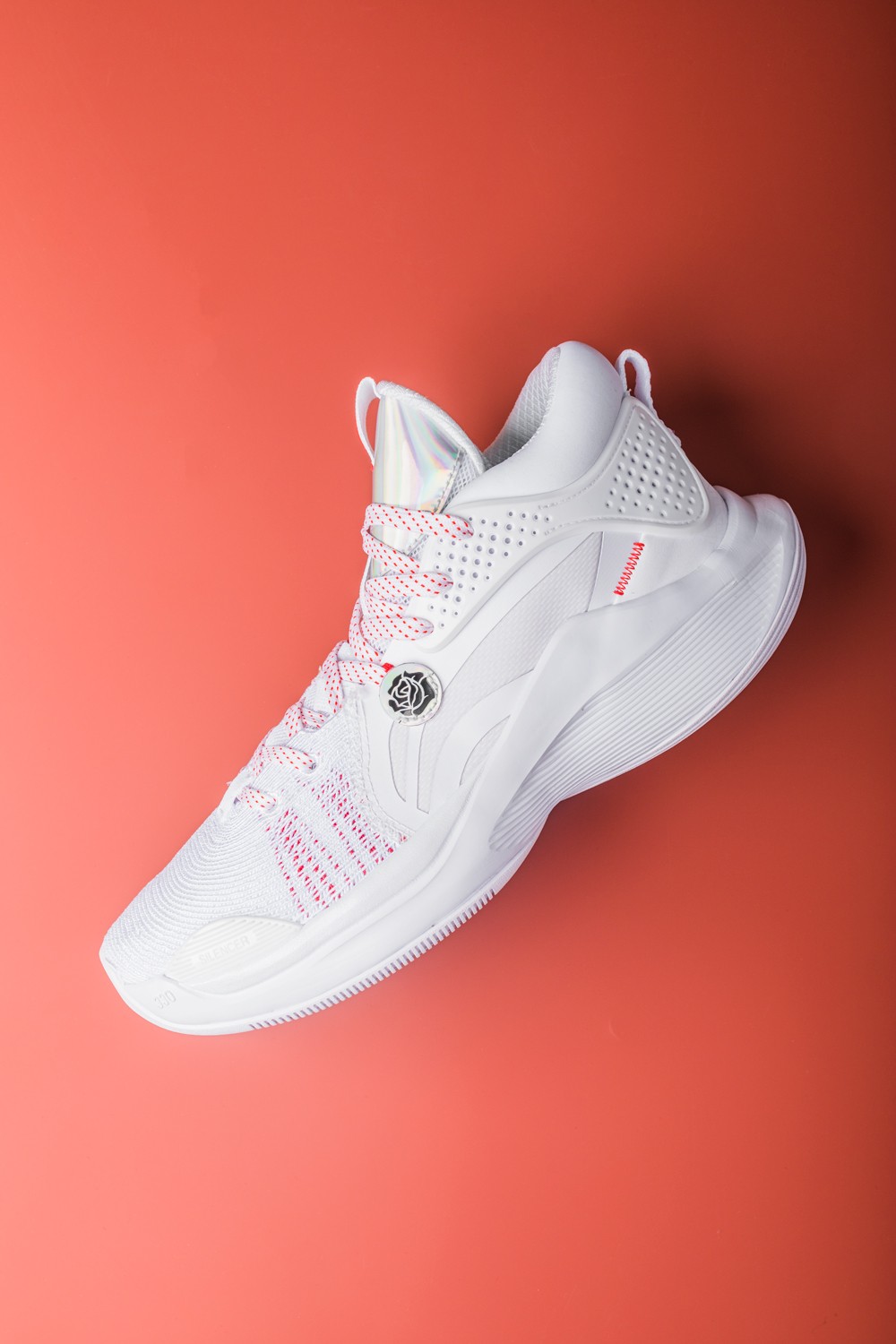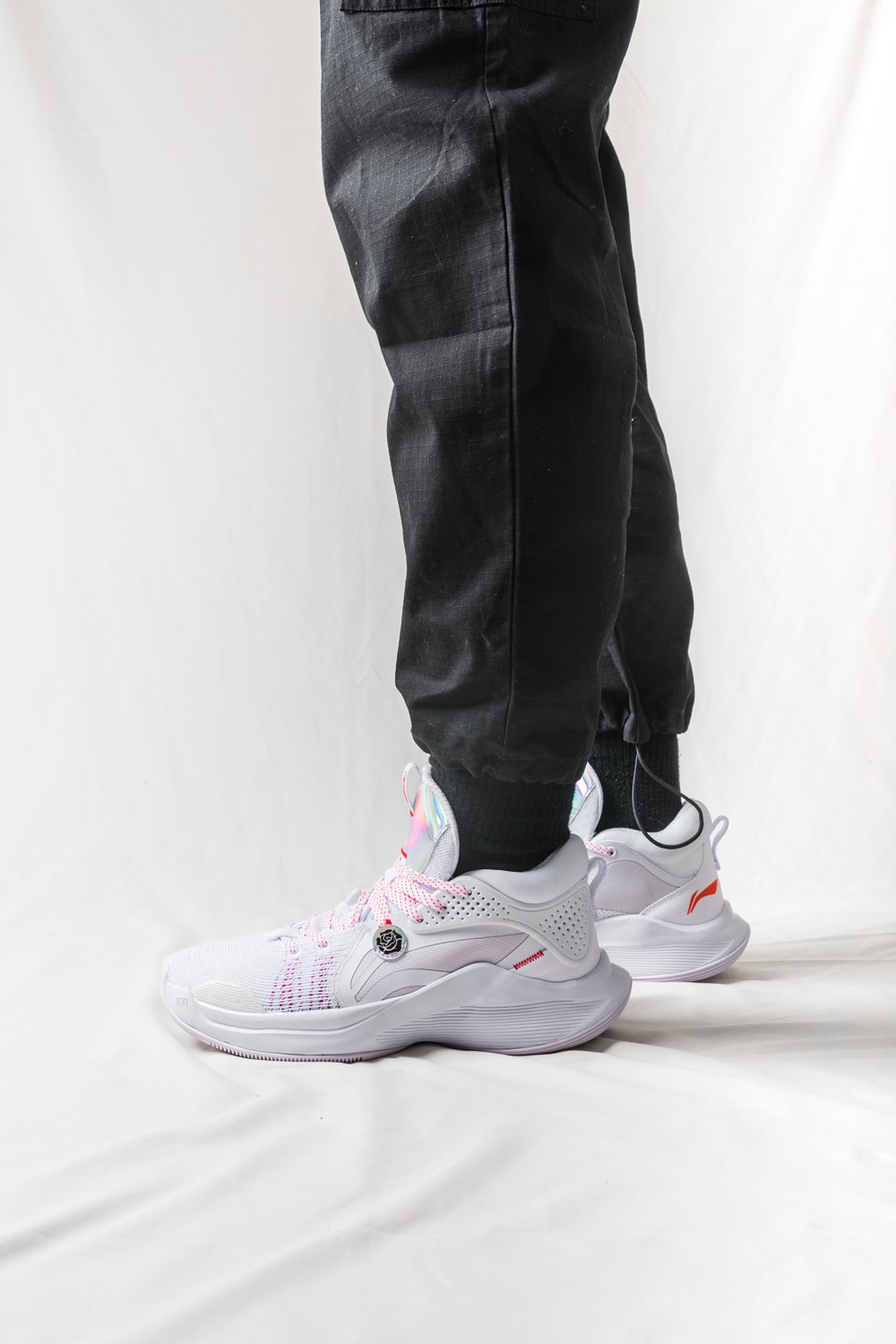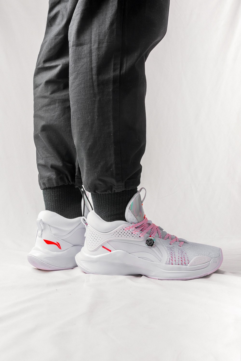 侧身处超大李宁 Logo 还缀以电镀样式的玫瑰花图案,彰显品牌及签名鞋款身份。