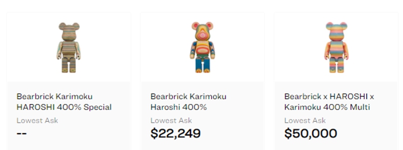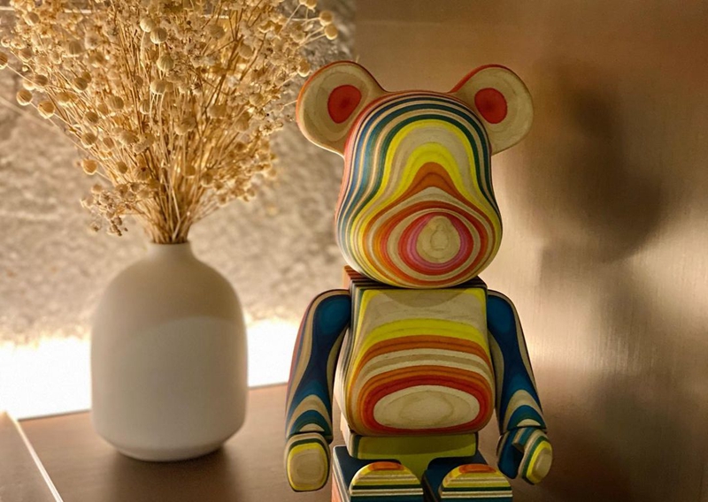 从图片中可以看出,上来就是 BE@RBRICK x Haroshi x Karimoku 的三方联名,是由废弃的彩绘滑板制成,虽然是一只 400% 比例的小熊,但目前市场价格已经达到了 ¥140000 元。