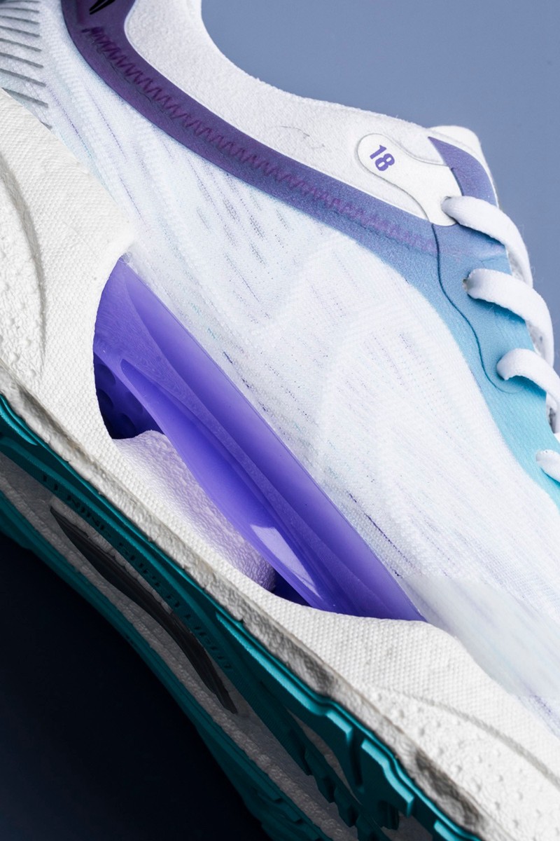 另外,灵感来源于古琴的中底的镂空结构设计,在最大化减轻重量的同时,为脚部带来更好支撑。