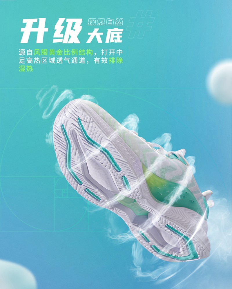 外底设计从风眼黄金比例结构中汲取灵感,中部设有透气通道,保证排气。