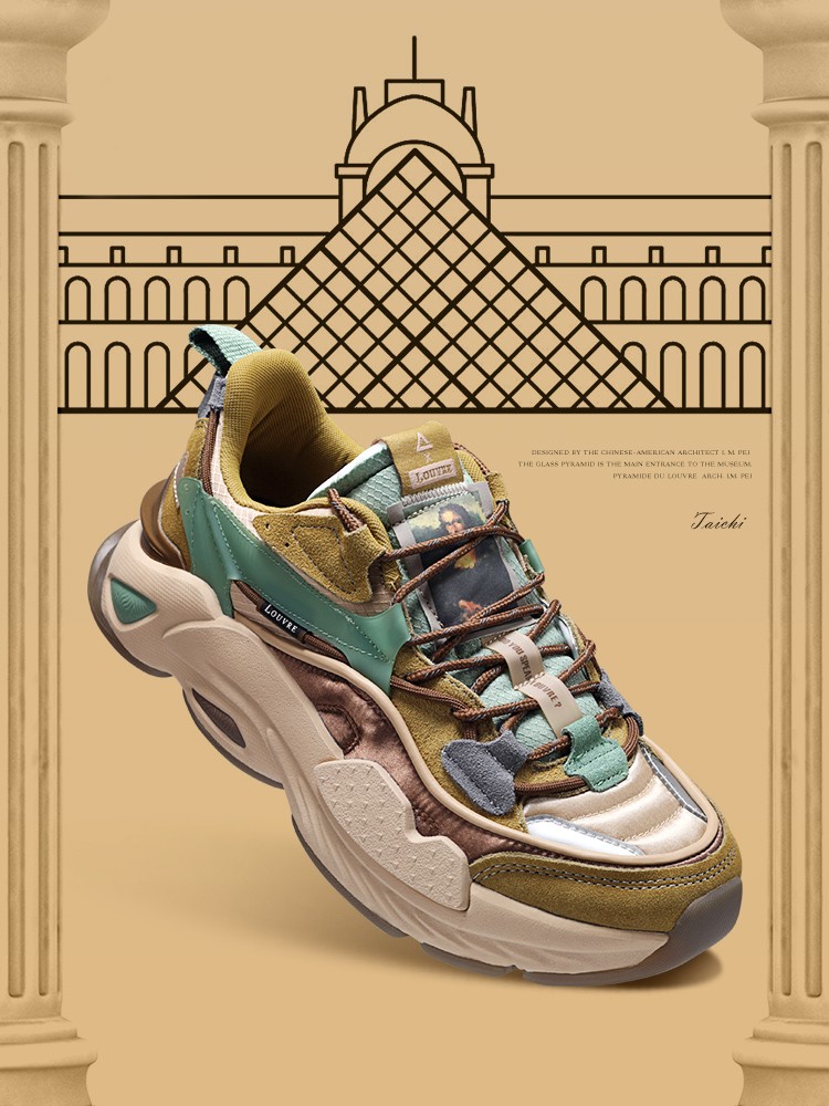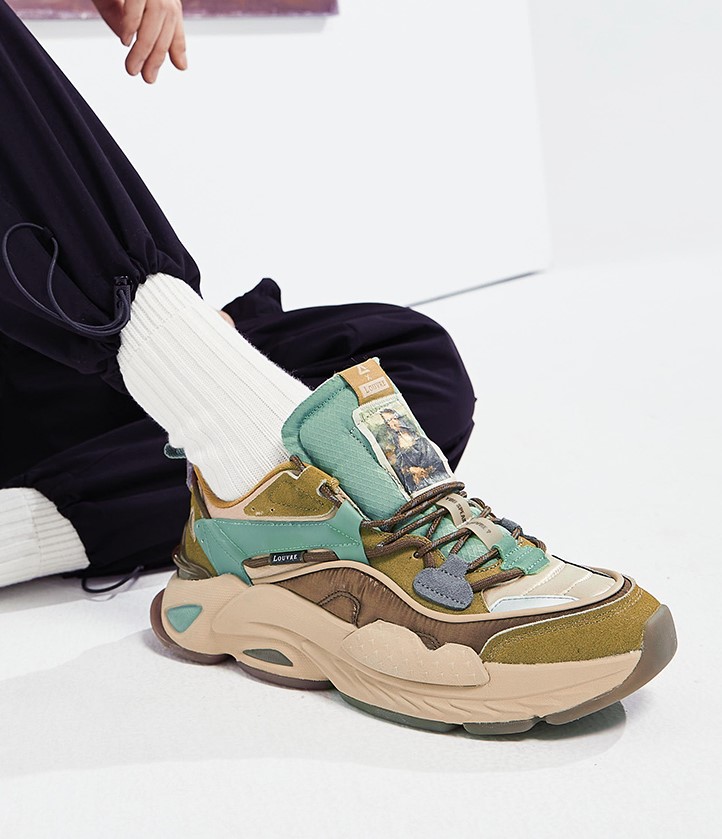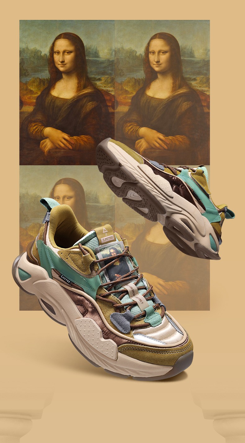 整双鞋的配色灵感来自世界名画蒙娜丽莎,米白色、棕黄色、卡其色以及湖绿色搭配在一起,十分协调。