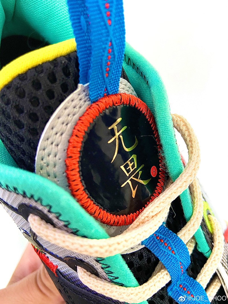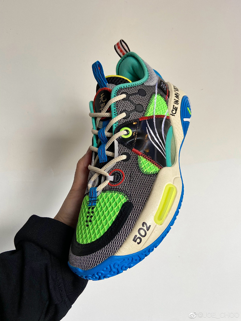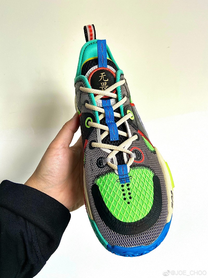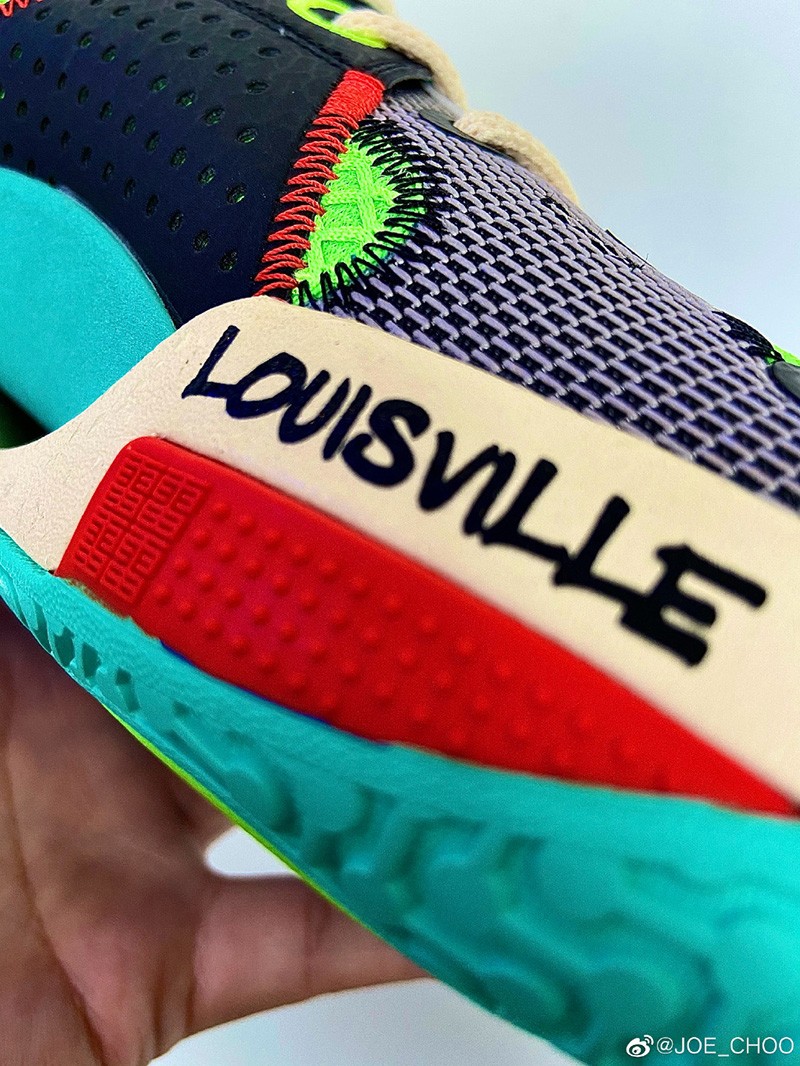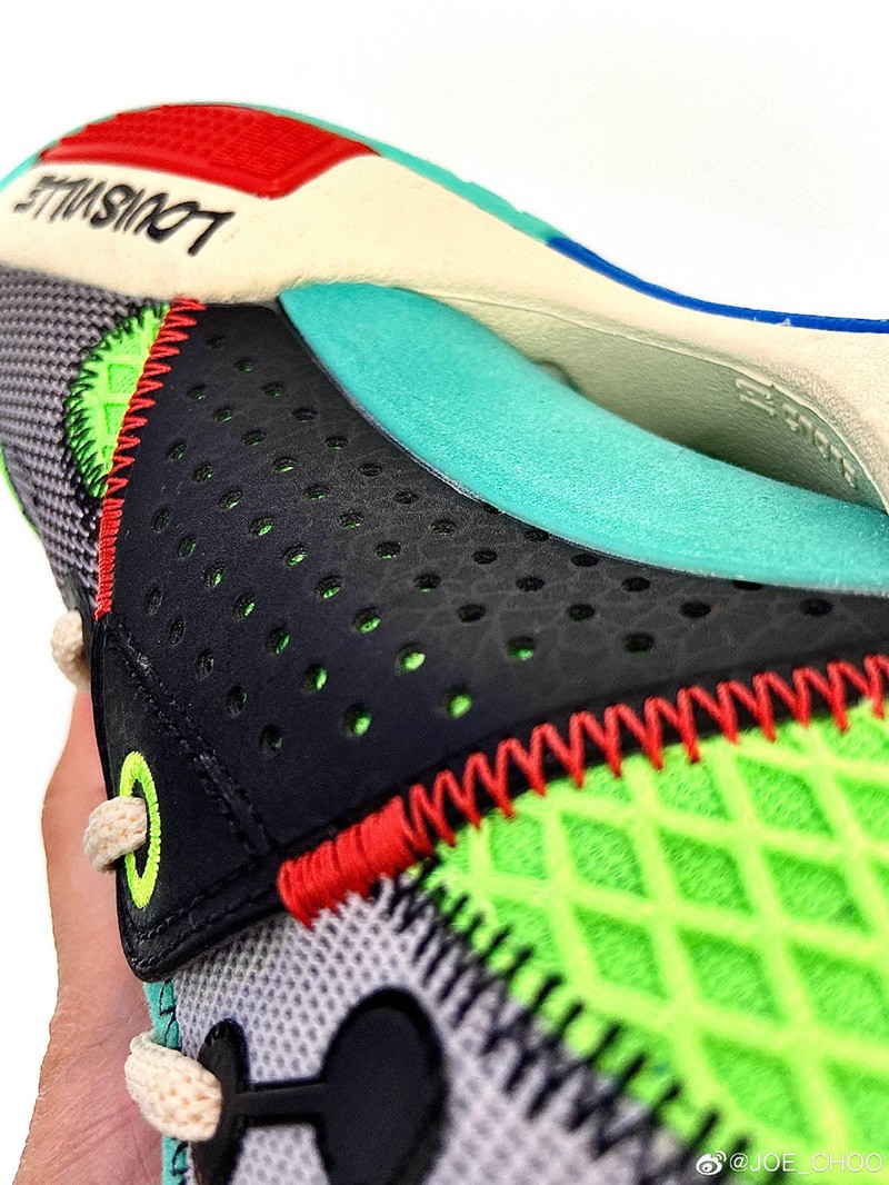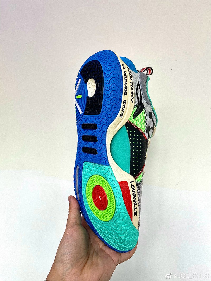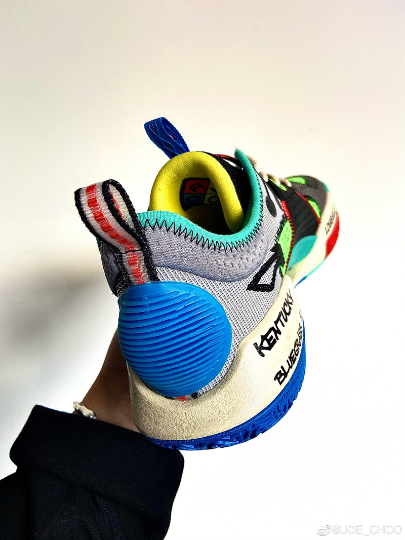 而设计师周世杰也第一时间晒出了更为清晰的完整实物,整体采用黑、绿、蓝、红、黄等丰富配色构建鞋身,围绕拉塞尔故乡肯塔基州的手写涂鸦点缀多处。