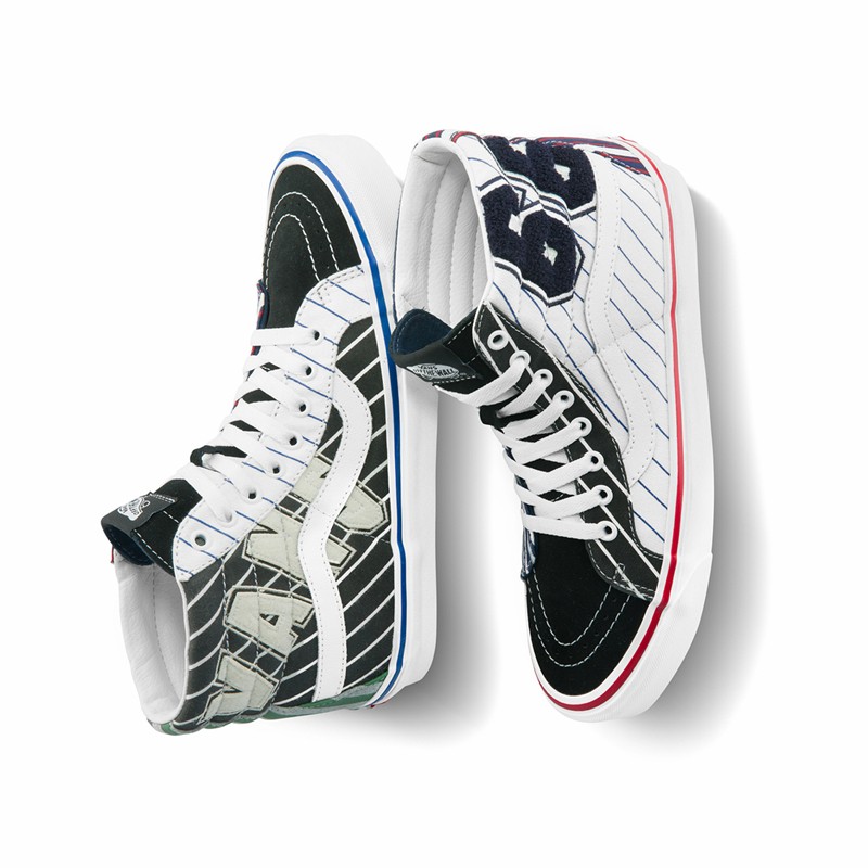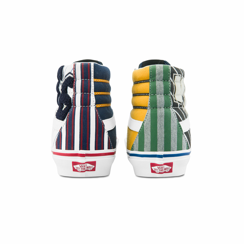 Sk8-Hi 在鞋腰处饰以白色的 Vans Logo,后跟则是带有个性的复古绿和灰色条纹印花。