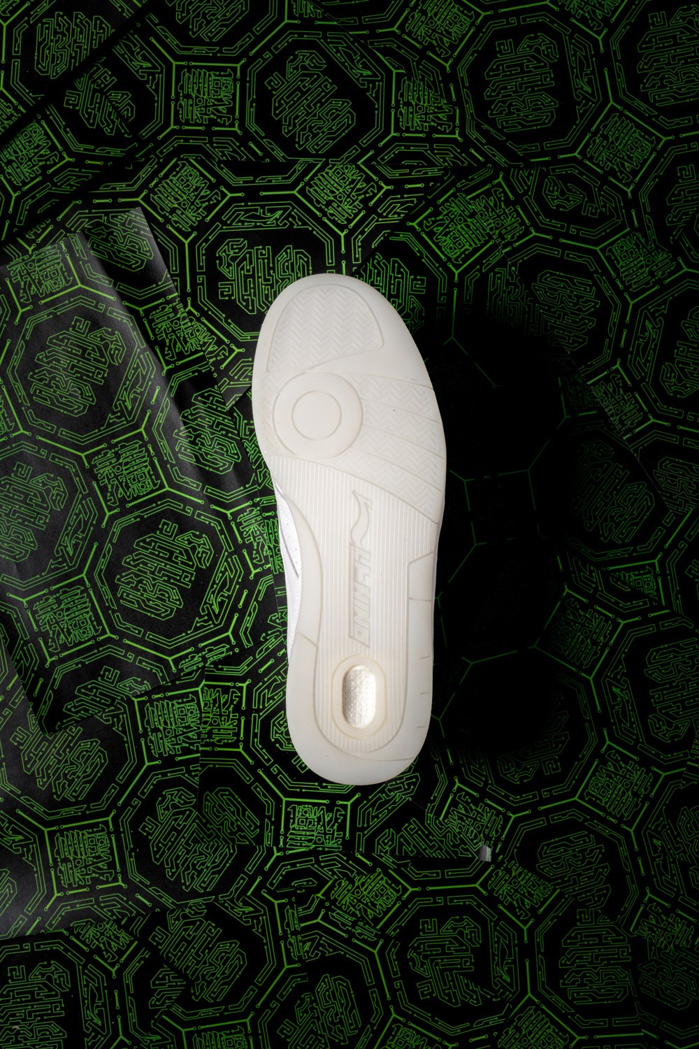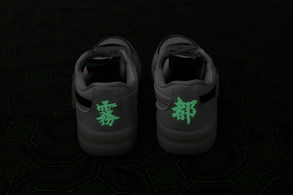 左右脚的后跟分别印有 “霧”、“都” 两字,自带夜光效果,彰显配色主题。