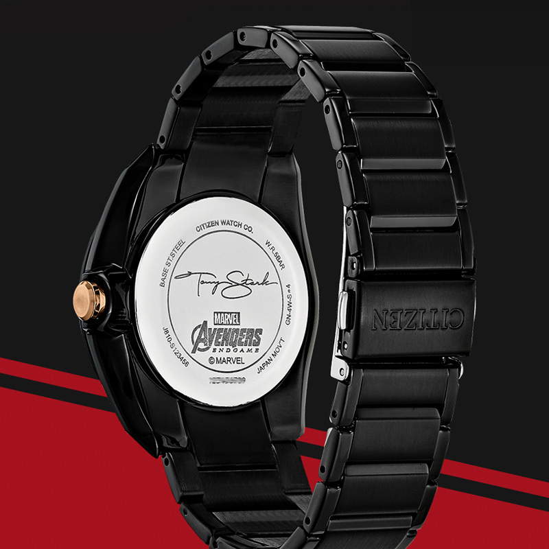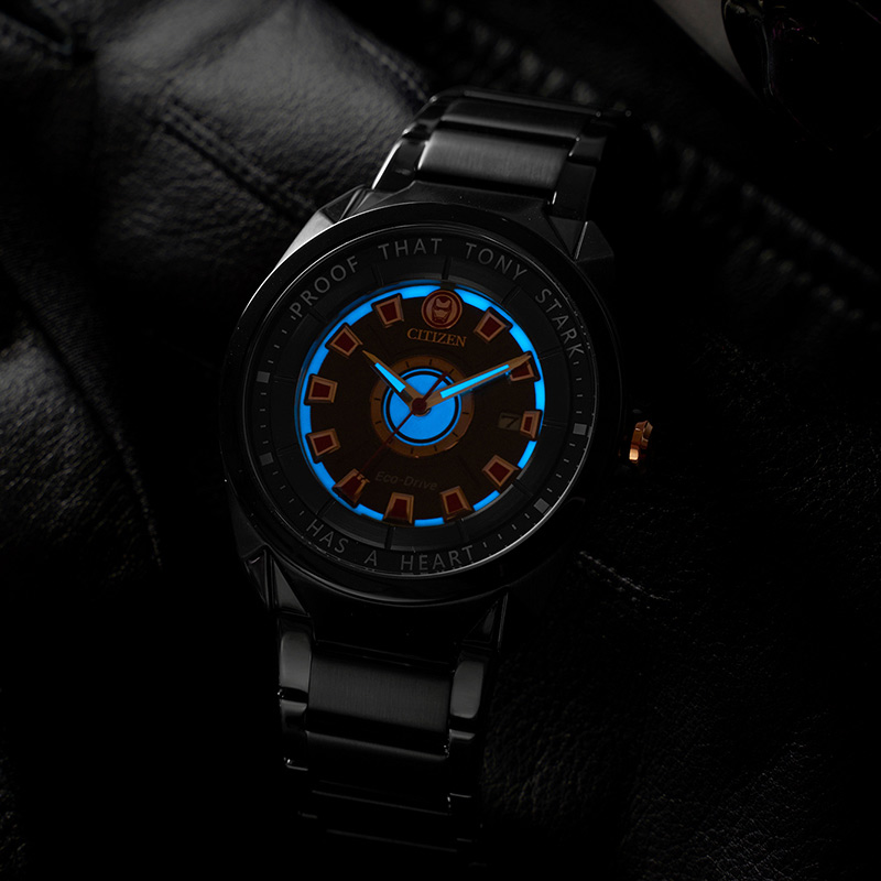 以劲酷的黑色金属质感贯穿,表盘则再现了钢铁侠最具辨识度的「动力反应堆」。