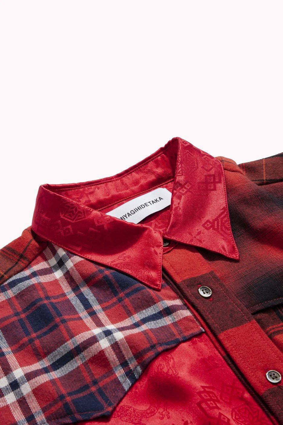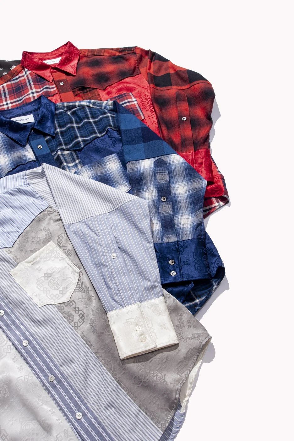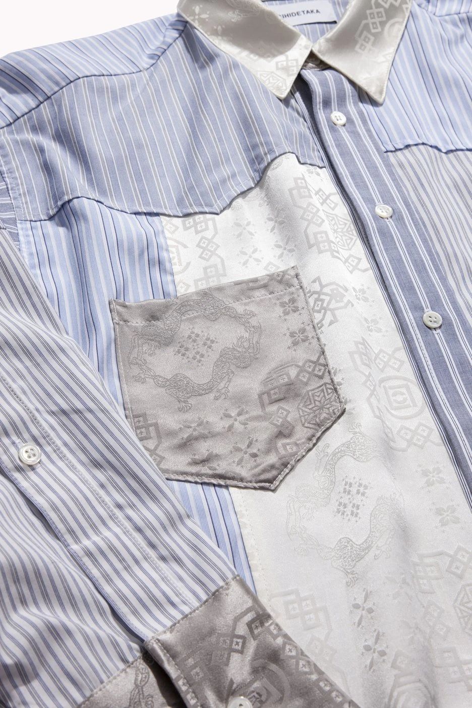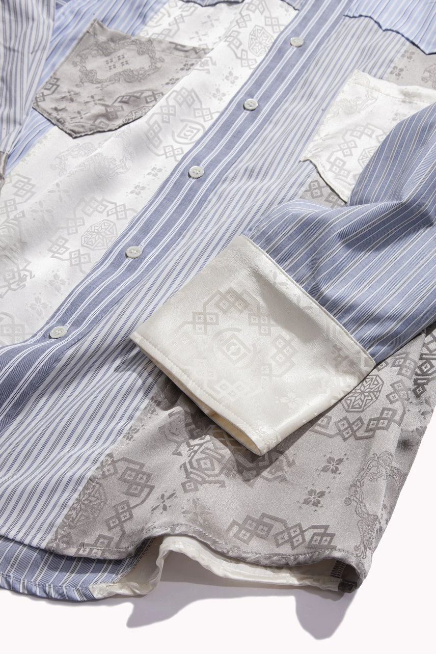 通过 MIYAGIHIDETAKA 标志性的拼接设计,将 CLOT 的丝绸融入其中,将两个品牌的特色巧妙结合,彰显联名身份。
