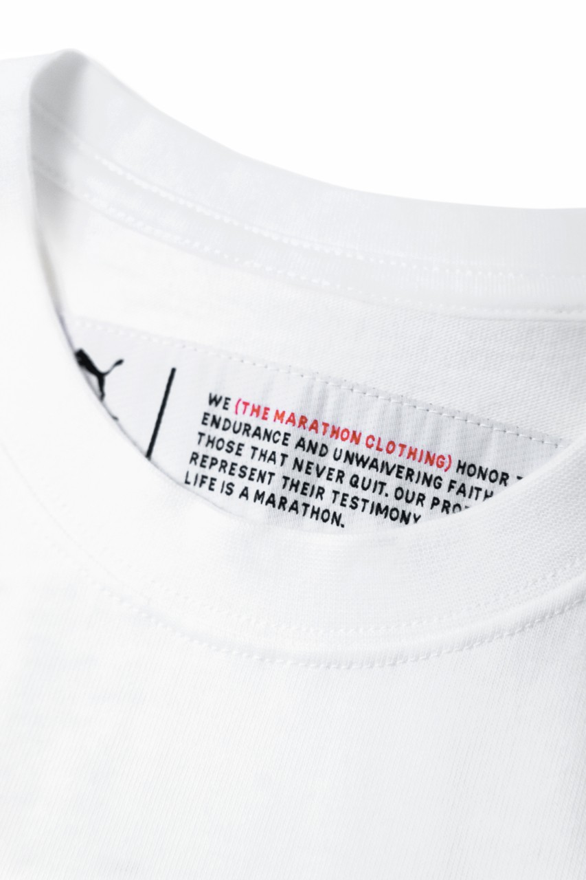 白色 T 恤上印有马拉松及 PUMA Logo,标签上描述了马拉松系列。