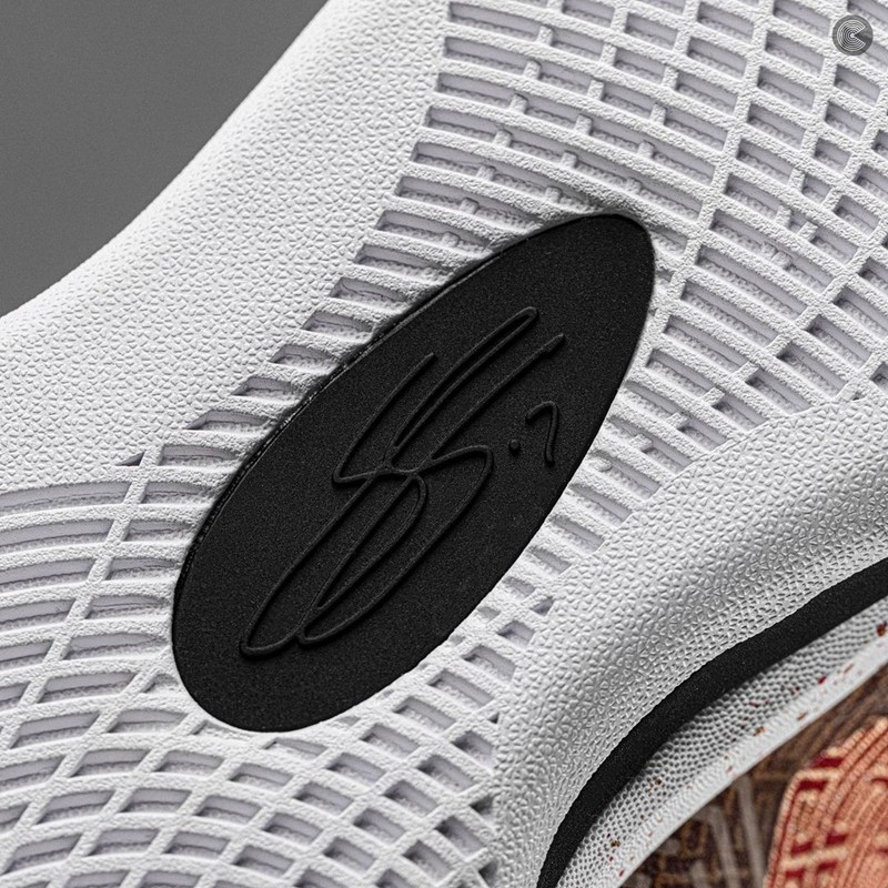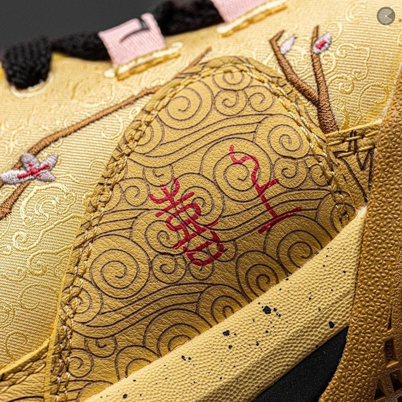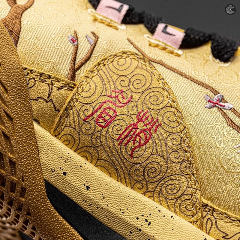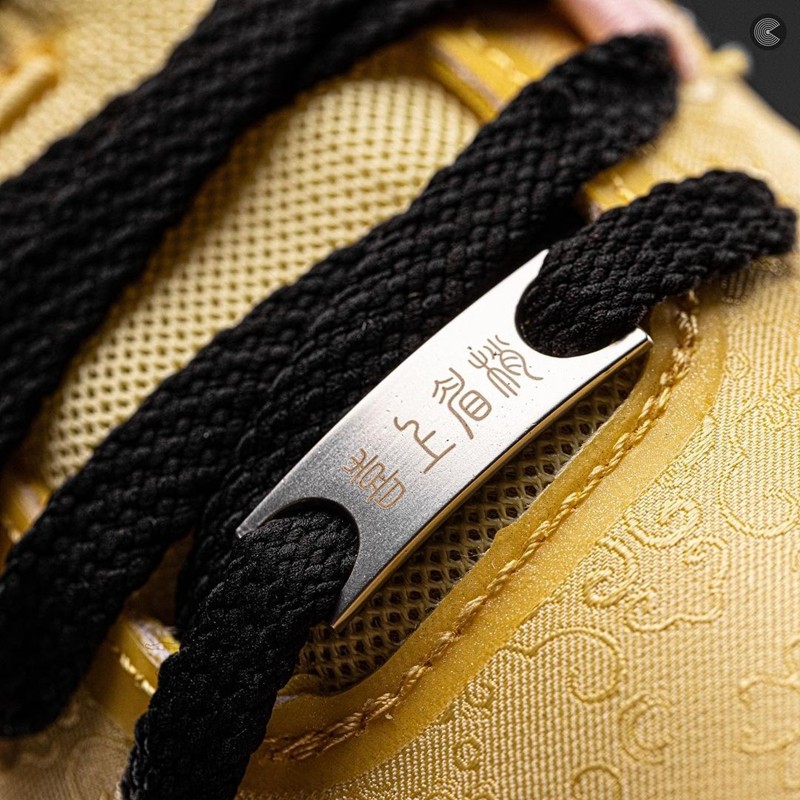 第二双称为「旗开得胜」,鞋身以红黄相间的花纹作为主体,外侧的透明 TPU 抗扭上写有金色的「旗开」和「德胜」字样。