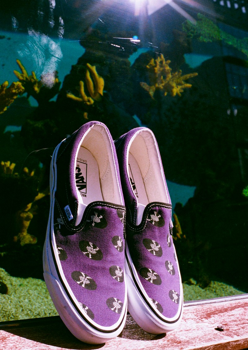 鞋款方面,以 Vans 经典鞋款 OG Slip-On LX 为蓝本打造,白、紫和深红三色鞋面,印有 Vans 标志性棋盘格和黑胶唱片图案,完美融入 Wacko Maria 的美学理念在 Vans 鞋款上。