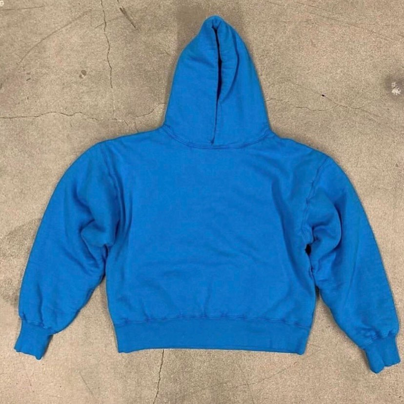 其次就是接连晒出的实物图片,延续纯色系调性之外,最为抢眼的还得是侃爷上身同款的 GAP 蓝帽衫。