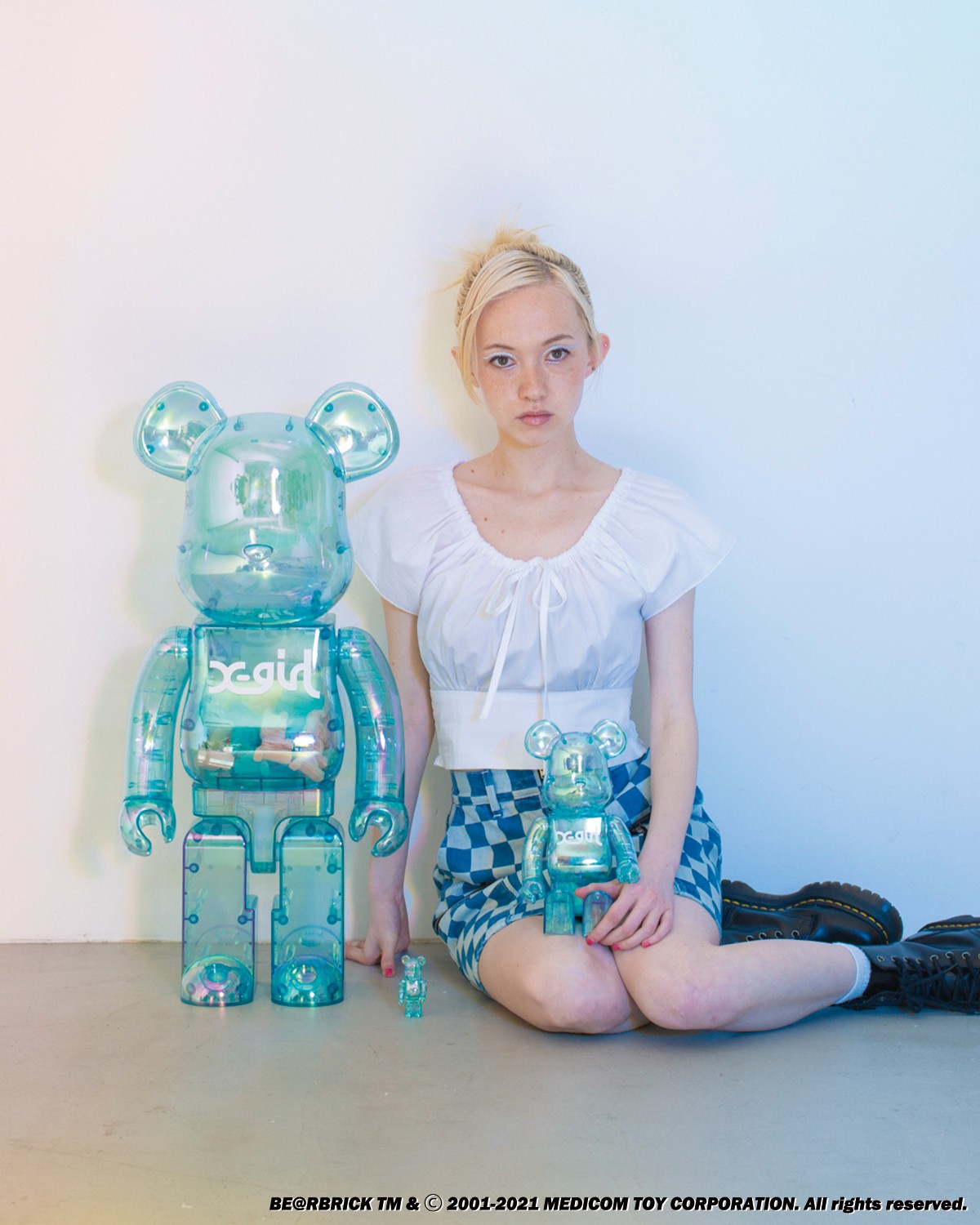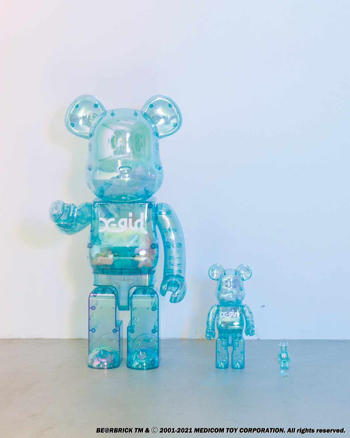 今年 2021 合作款正式发布,这次双方采用具有高级感的柔雾蓝彩虹色透明外壳, 内部装有彩色夜光 X-girl logo 的积木设计,既保留了经典的 Be@rbrick 形体特征,又融合了 X-girl 街头文化元素。