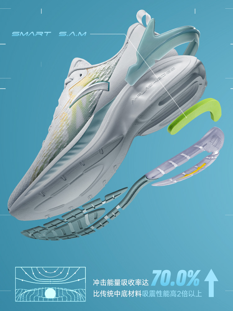 在创跑鞋 1.5 中同样使用的是 SMART S.A.M 军用防弹衣的材料转化而成的高强度吸震黑科技。对于落地时冲击能量的吸收率达到了百分之七十。
