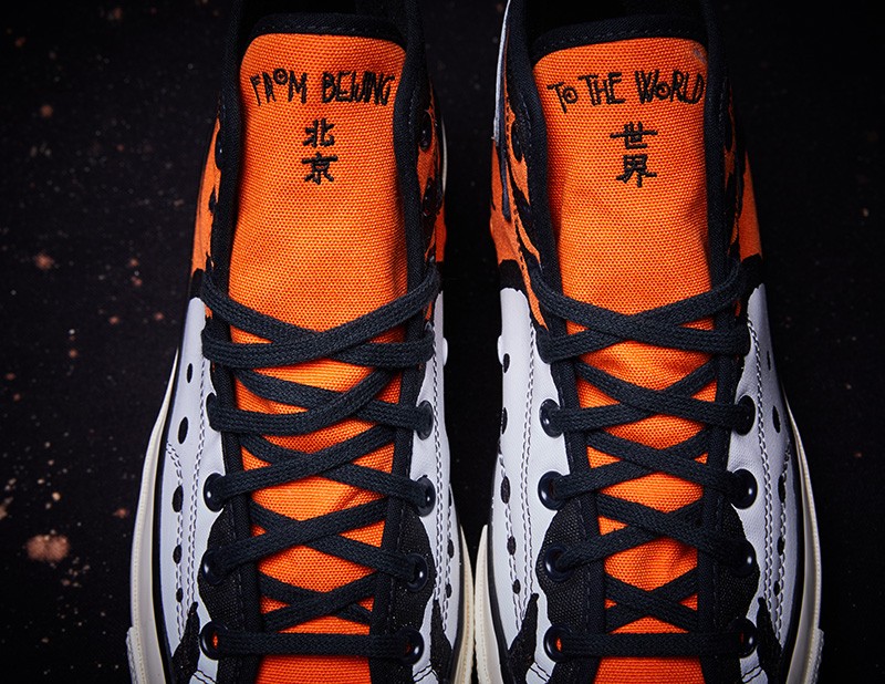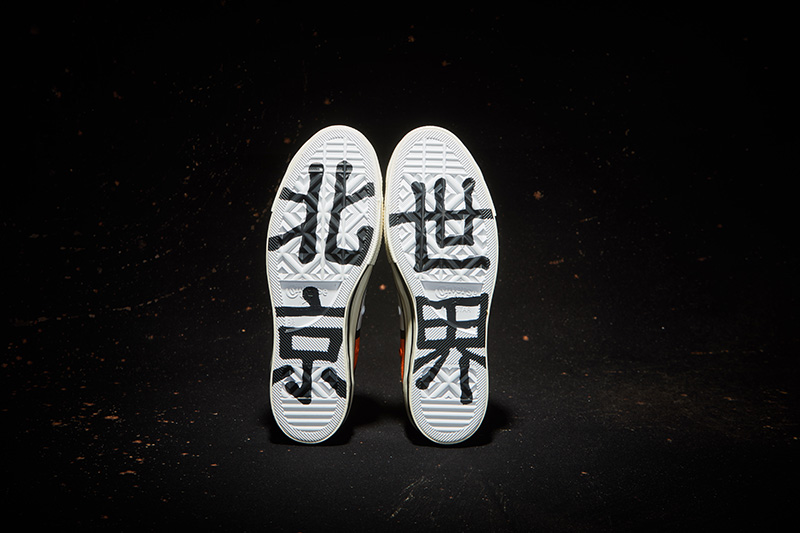 鞋舌部位左脚刺绣 “FROM BEIJING 北京”,右脚刺绣 “TO THE WORLD 世界”,直击联名主题。