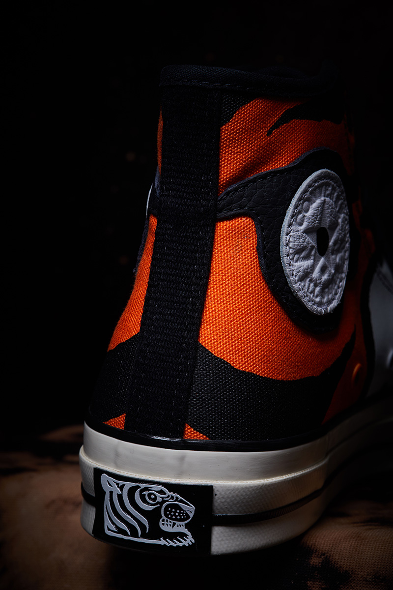 巧妙将 “虎眼” 与 Chuck 70 内侧圆章 Logo 融合,传统的 Chuck 70 白色鞋头特意改为黑色,生动作出 “虎鼻” 装扮。