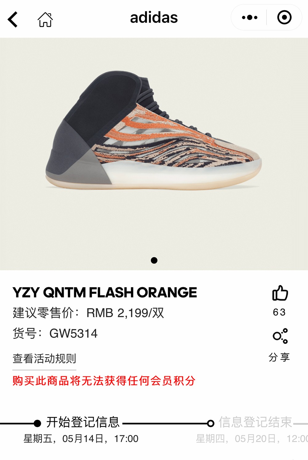目前,adidas 会员中心微信小程序已经正式上架预告,5 月 14 日 - 5 月 20 日开始登记,5 月 20 日 14:00 开始预约排队码。