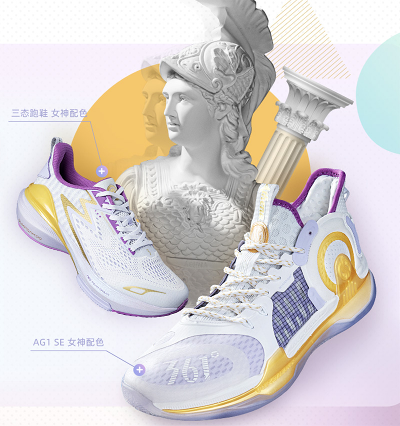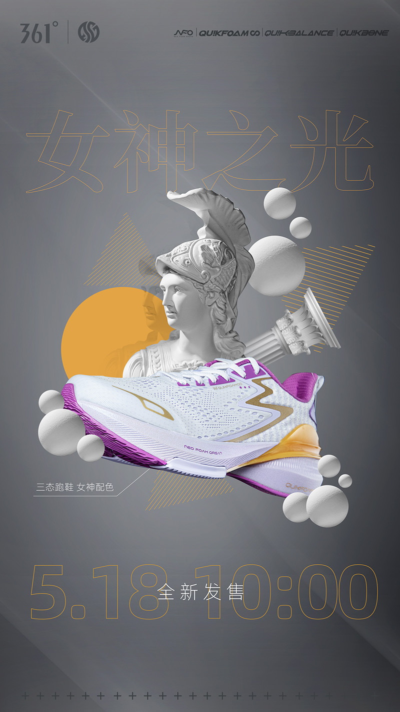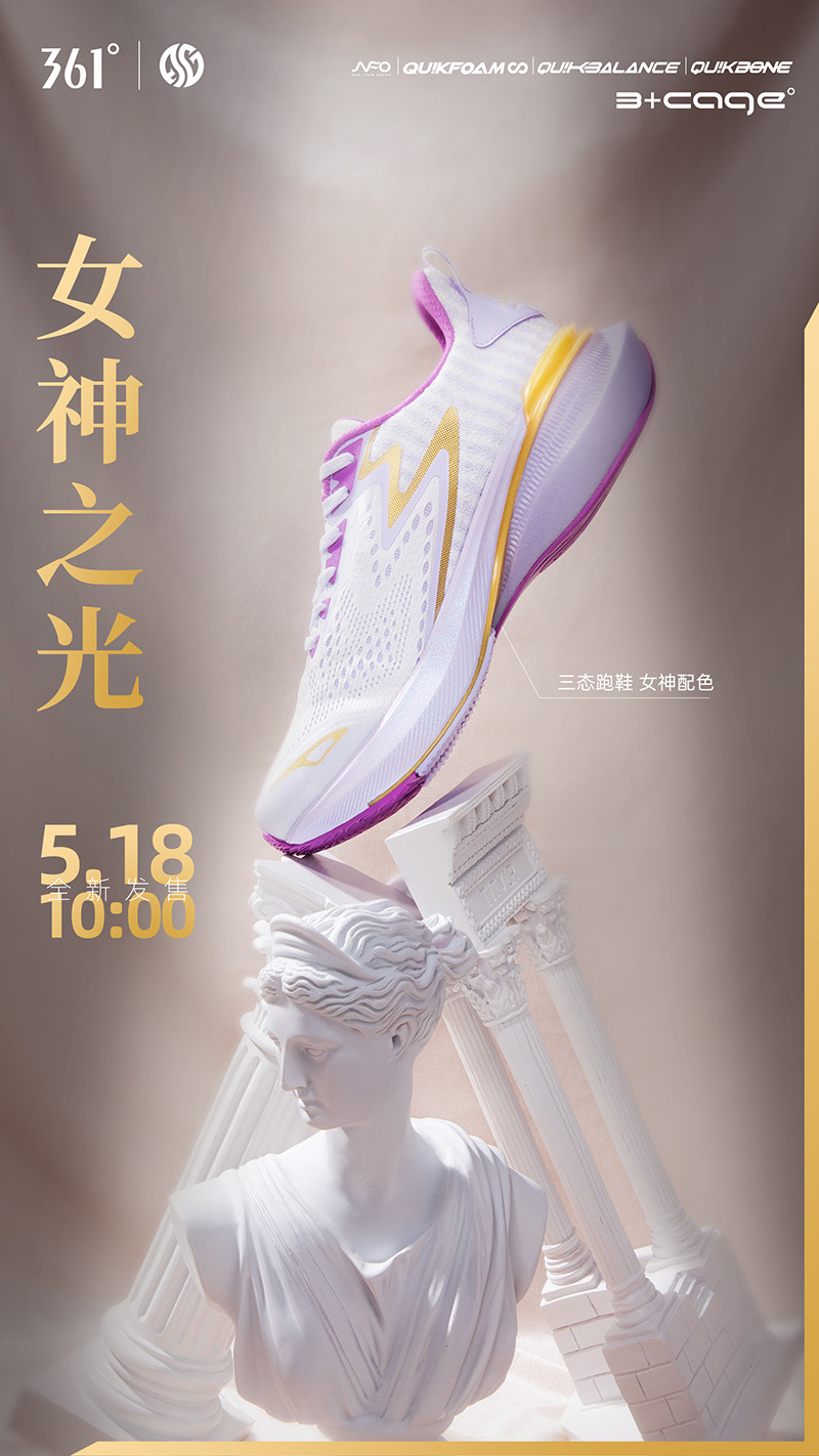 目前天猫 361度官方旗舰店已上线预告,确定将于 5 月 18 日明早 10 点正式发售,而令人意想不到的是,还有款同主题女神配色「三态跑鞋」一并登场。