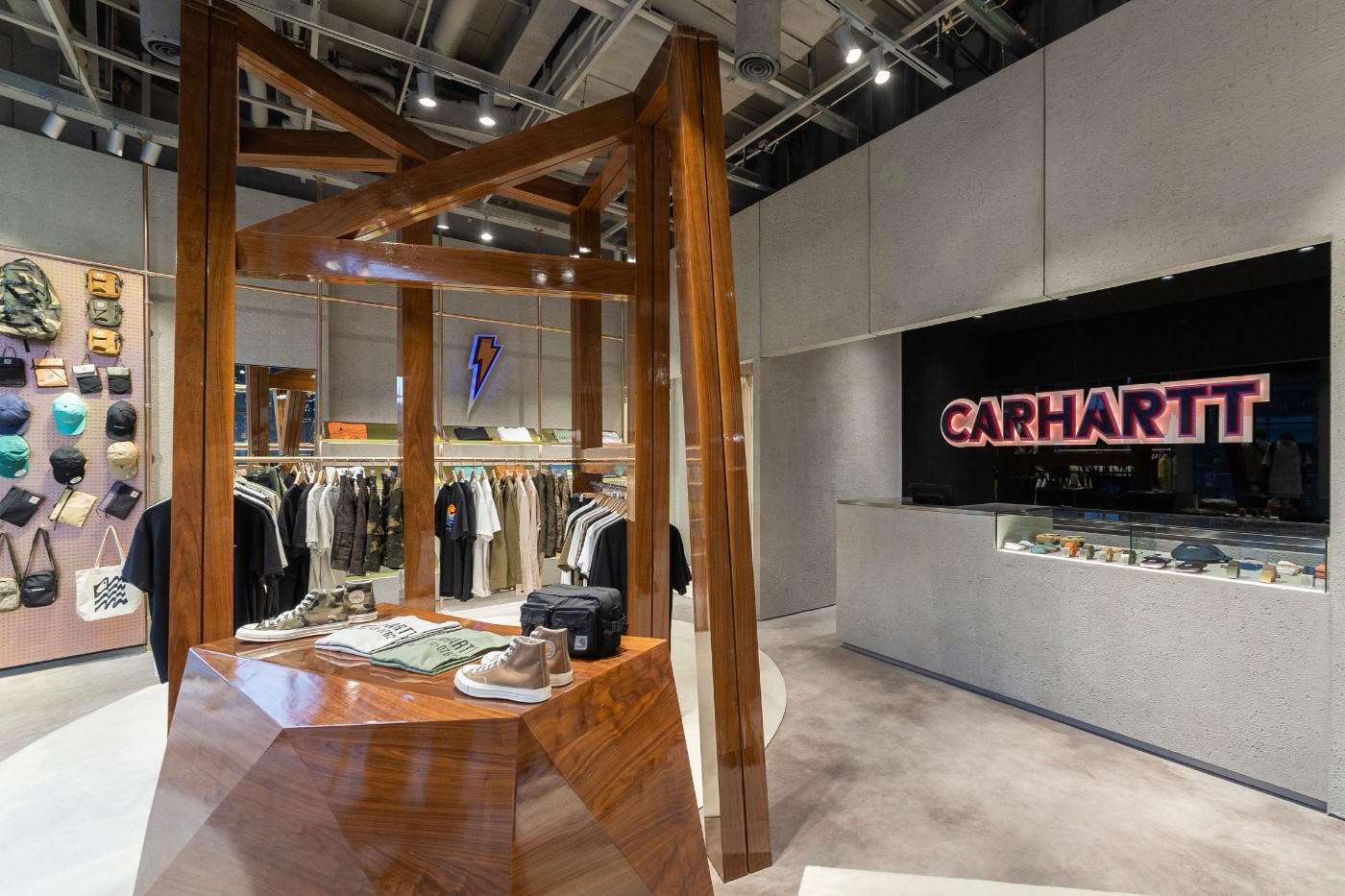 店内利用不规则的胡桃木组架穿梭陈列,贯穿全店提供视觉空间的分隔,构筑极具工艺感的轮廓线条,呈现 Carhartt WIP 的实用美学。