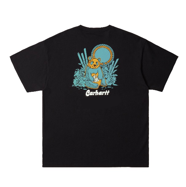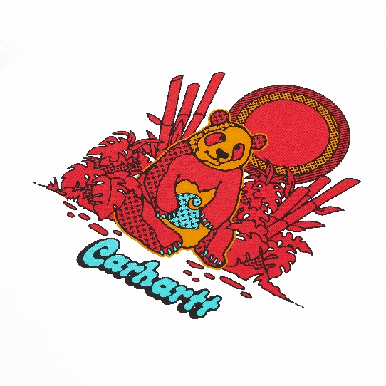 背面图案以国宝大熊猫为灵感,手捧经典 Carhartt C-logo,背景融合传统竹林与亚热带绿植,以波普艺术风格的画风结合四川脸谱的色彩展现。