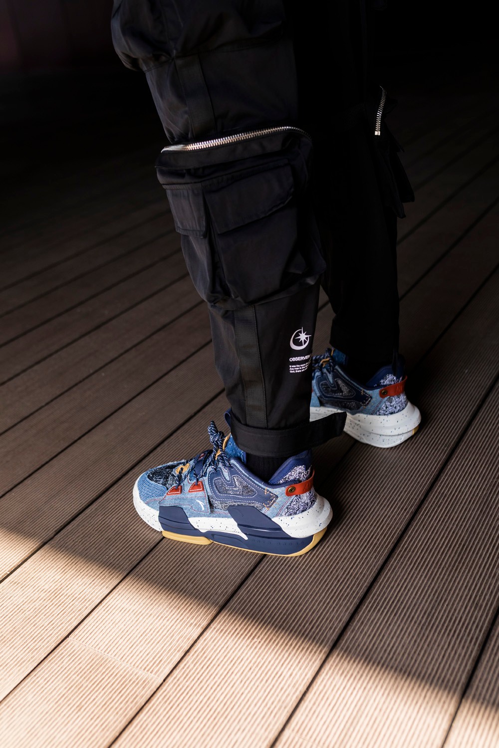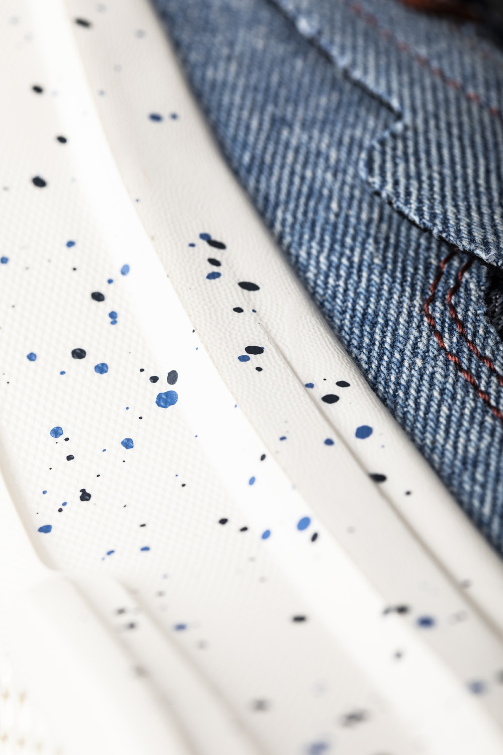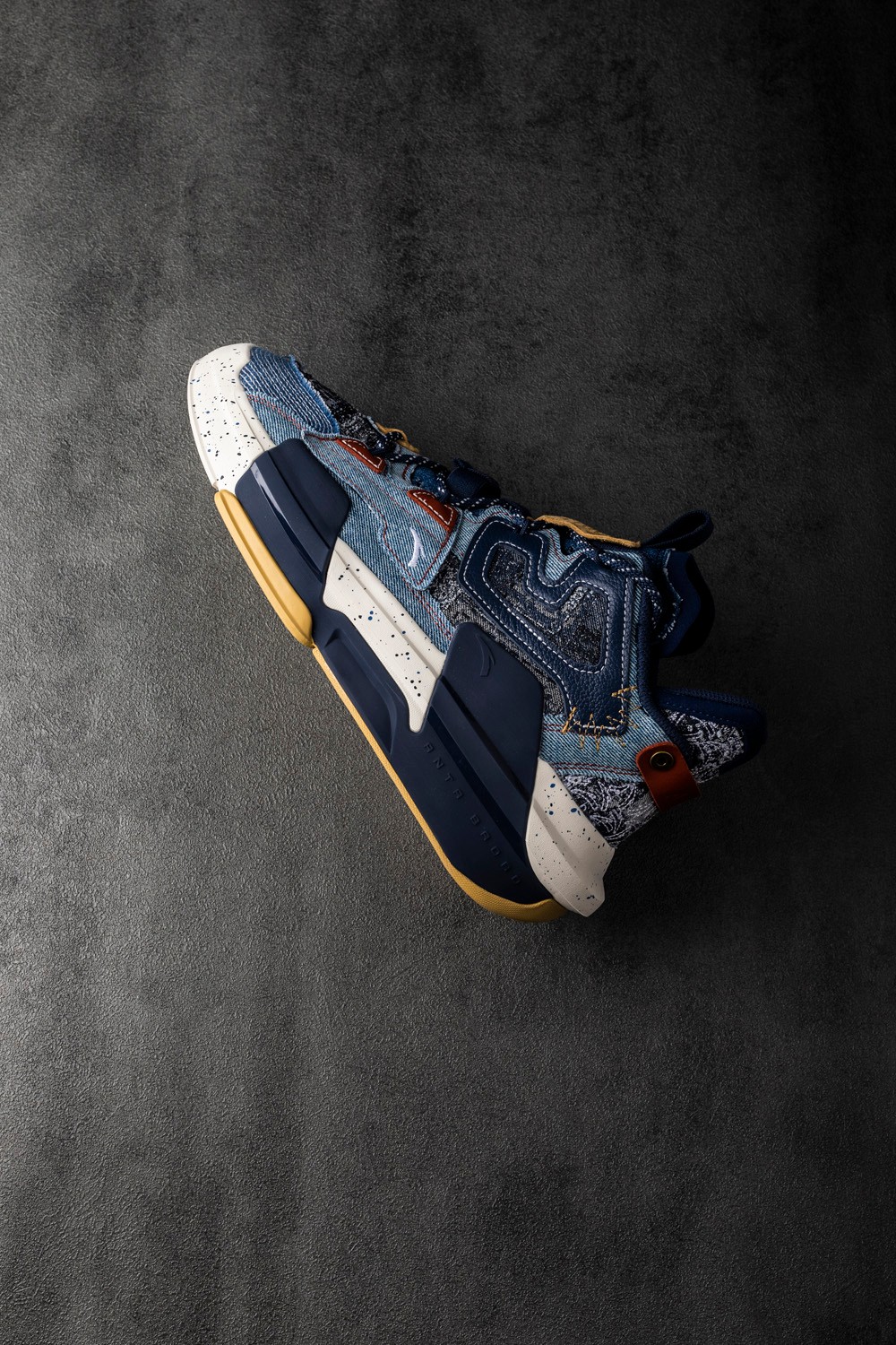 使用蓝色、黑色泼墨既在颜色上呼应了鞋身丹宁布,又增强了整体层次感。