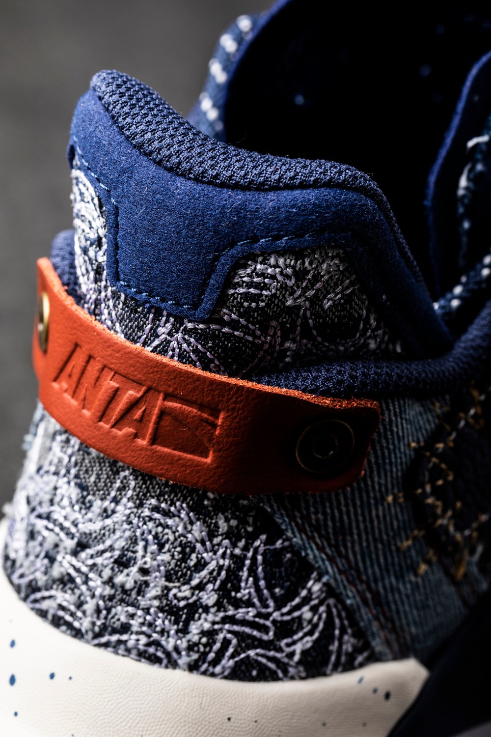 提环后的整块丹宁布上是满绣的安踏 Logo,极具创意。