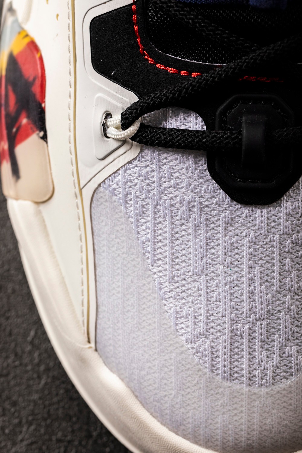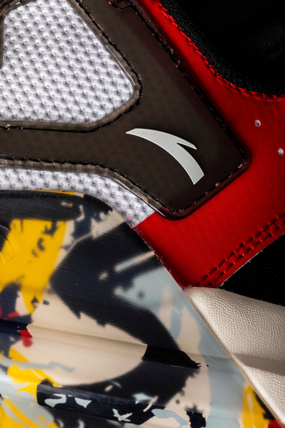 另一双涂鸦霸道 3.0 在鞋头、中底以及鞋身侧面的网面位置都采用了白色打造,侧面的防侧翻模块处使用半透明材质设计,并在透明材质下加入了涂鸦图案。