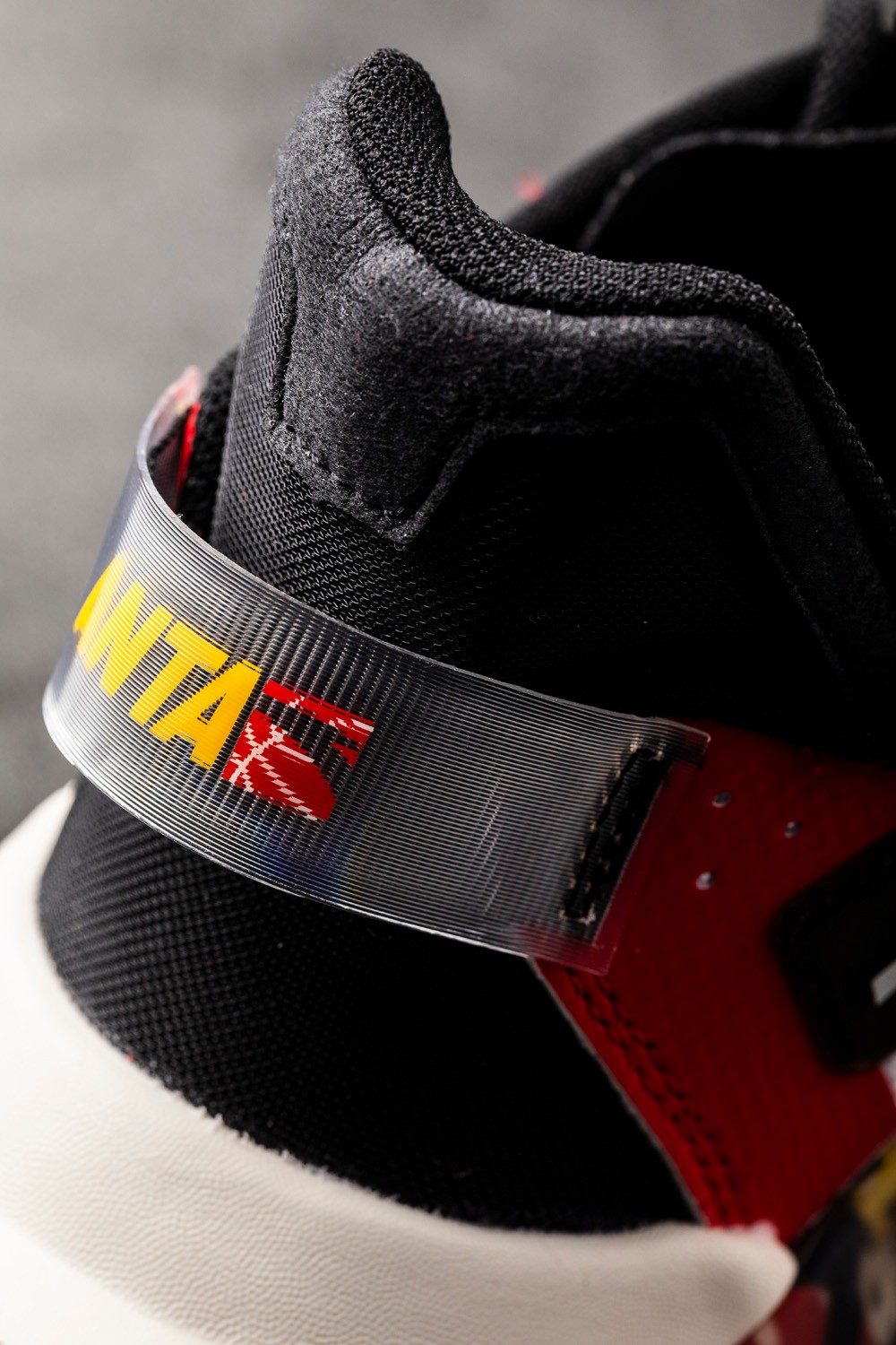 在后跟提环处采用双层设计,将安踏品牌名以及 Logo 呈现出 3D 效果。