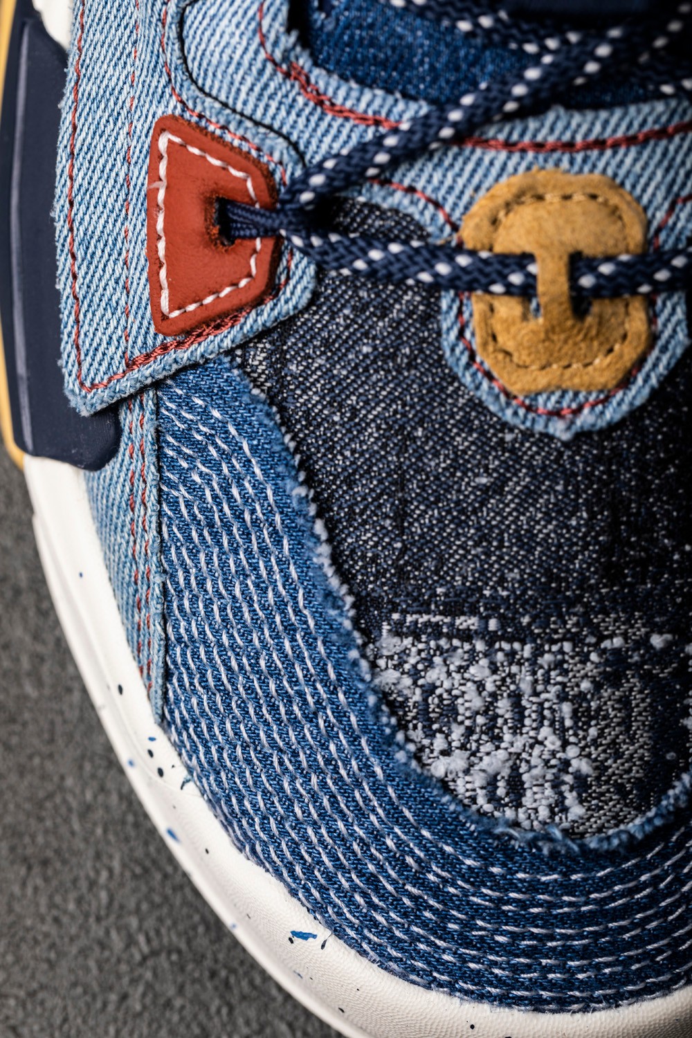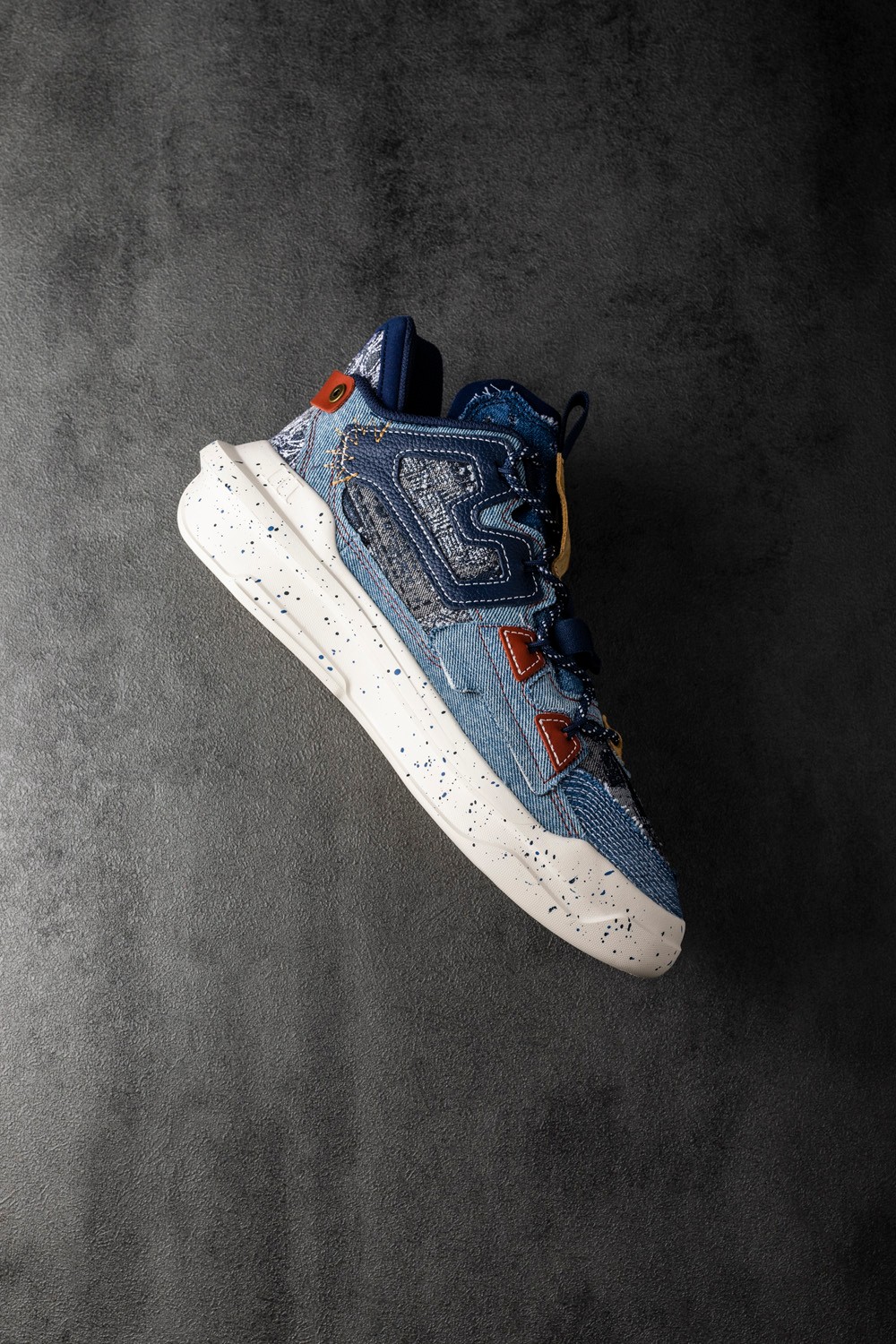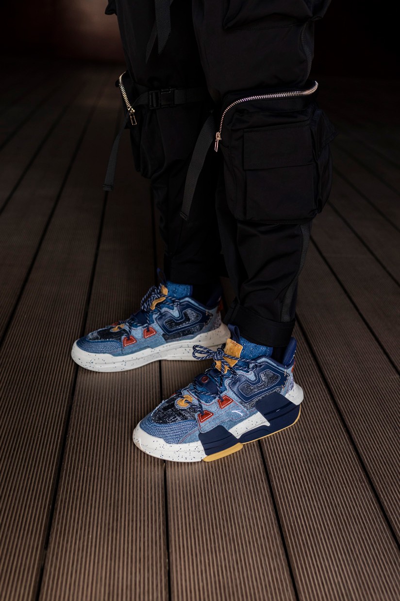 丹宁配色的霸道 3.0 用料十分独特,全鞋身覆盖不同颜色的丹宁布,质感满满。