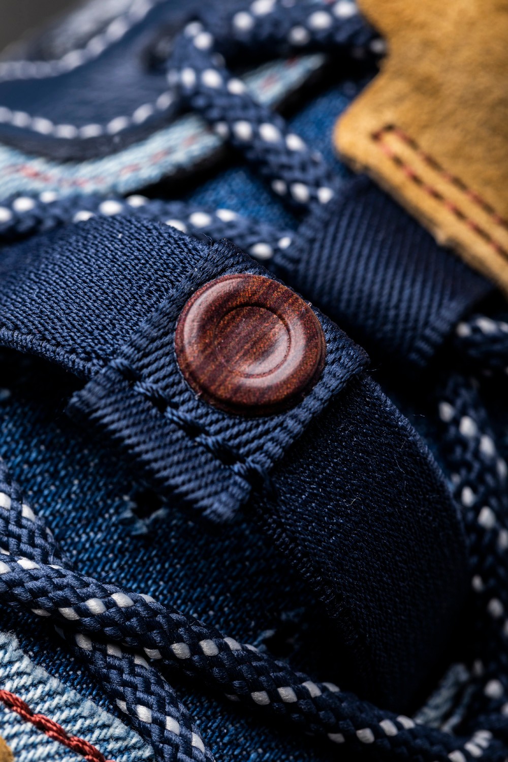 麂皮下方设置了一个具有弹力的蓝色绑带,并在绑带中央加入了一个木纹纽扣,此处除了点缀细节外,还让穿着时可以有更好的包裹性,一举两得。