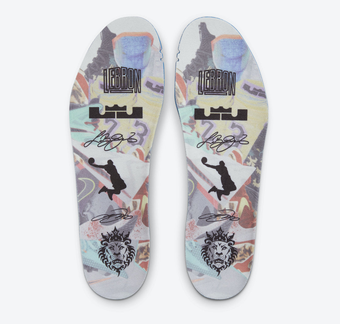 鞋垫的细节也很足,除了 LeBron 各个时期的 Logo 和签名外,还印了一些他其他鞋款和球衣的剪影。