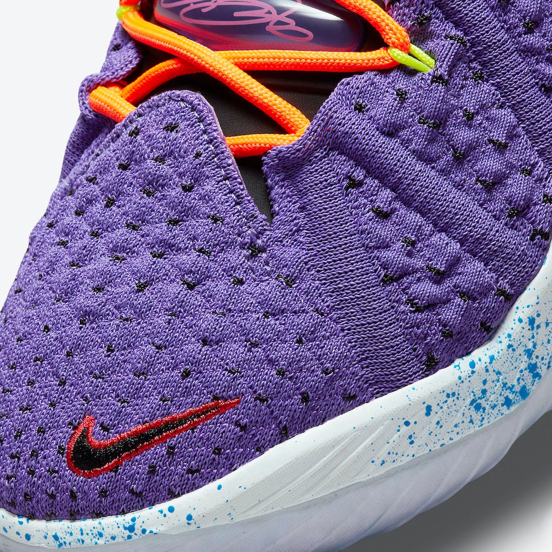 鞋款的针织鞋面使用紫色,鞋带为亮橙色,颜色碰撞,十分吸睛。