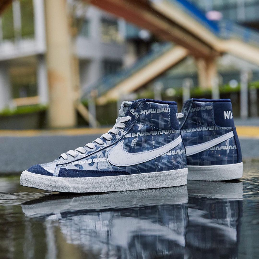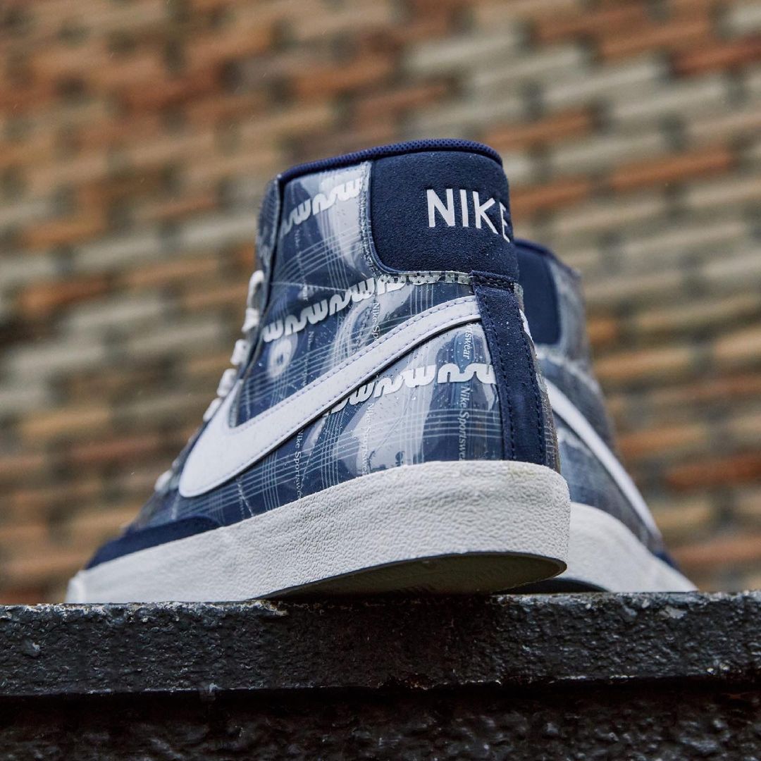 Air Max 95 和 Blazer Mid 鞋身采用了海军蓝格子图案,表面涂油乙烯材料,具有超强防水性的同时还有一定的透气性,打造全天候的百搭款。