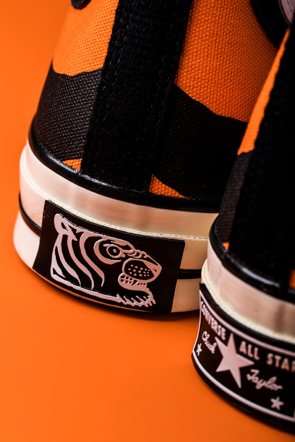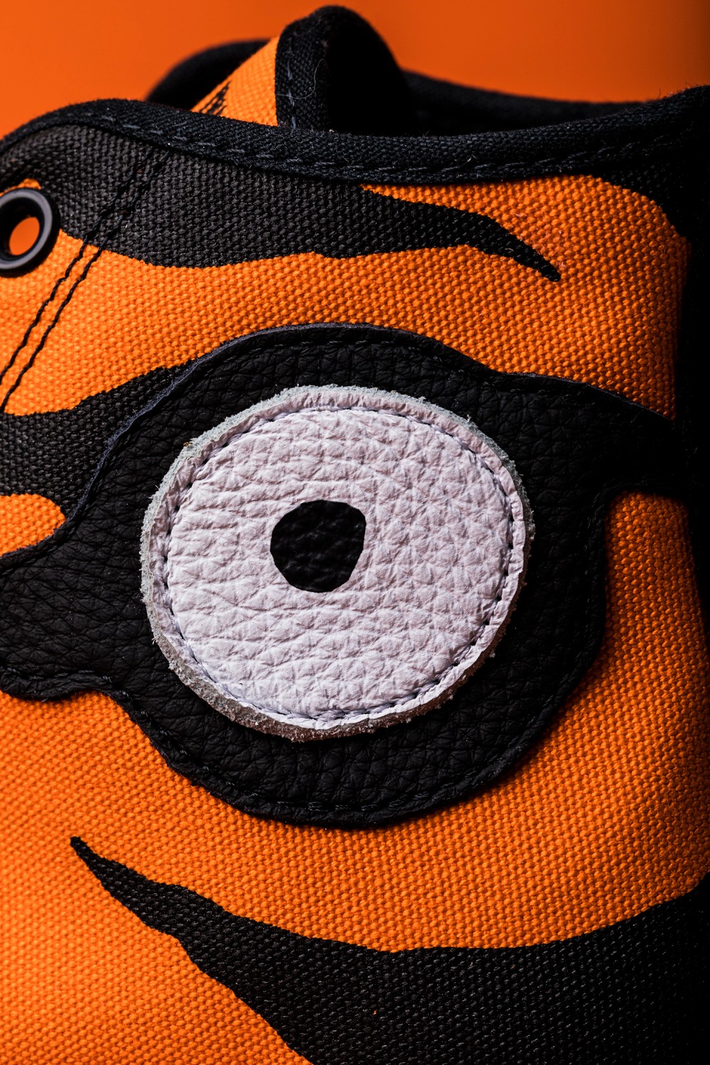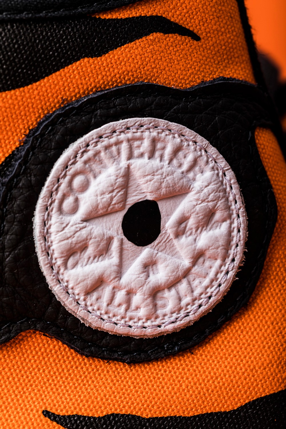 虎眼元素不仅以皮料拼接呈现在鞋帮外侧,鞋帮内侧的 Converse 星标也加入了点睛设计,成为另一只虎眼。