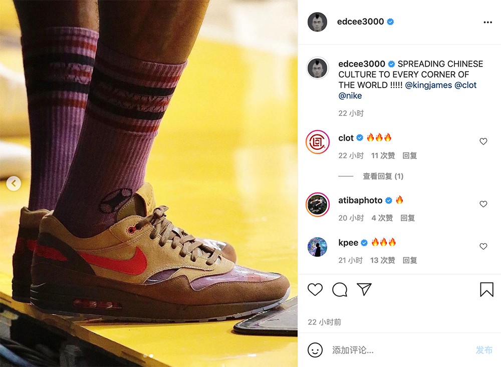 不仅因为冠希是湖人球迷,更因为詹姆斯经常带货 CLOT 联名鞋,让二人多了一重羁绊。