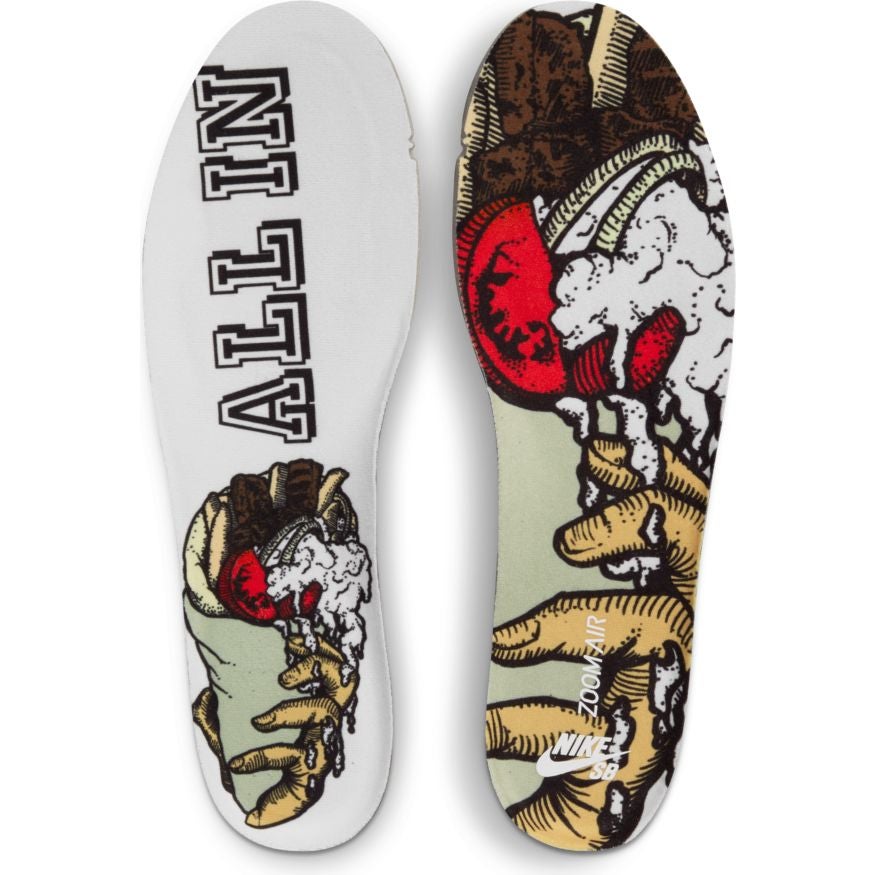 红色的 Swoosh 和鞋带则代表了卷在饼里的西红柿,后跟处的褐色大象爆裂纹是烤熟的肉类。