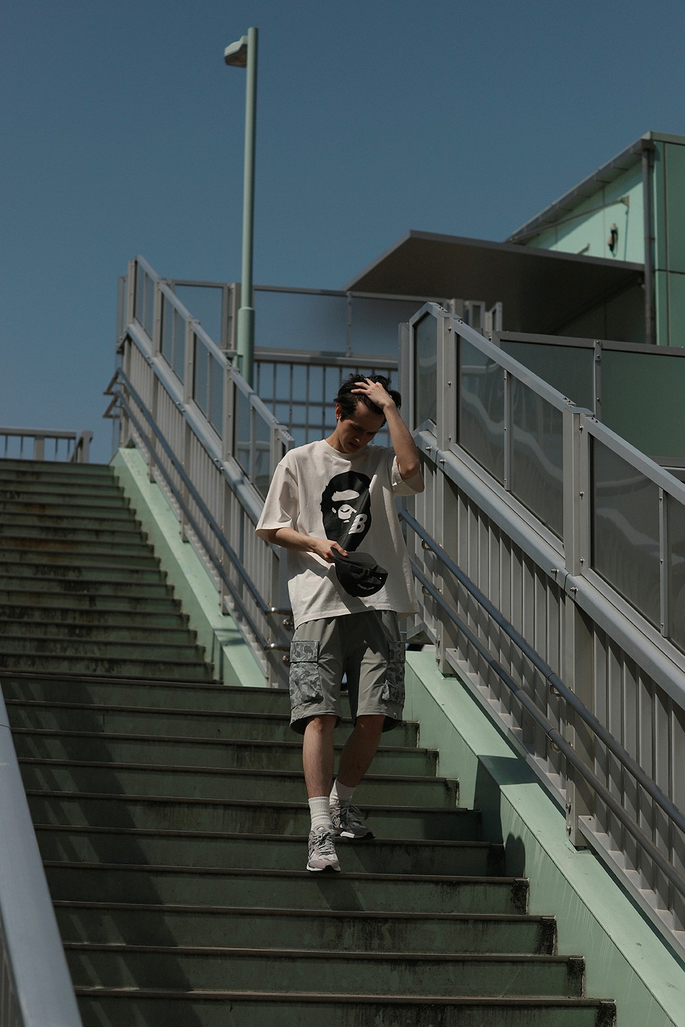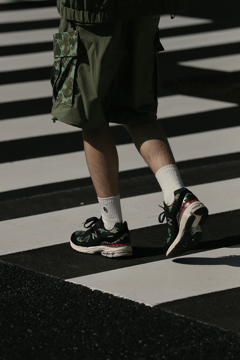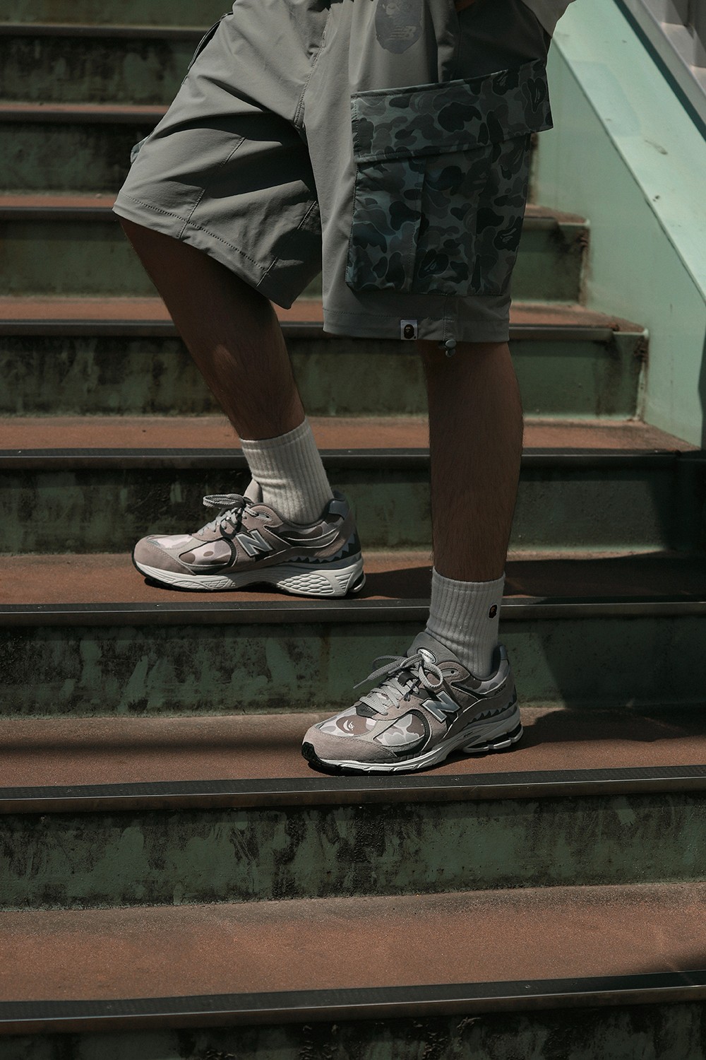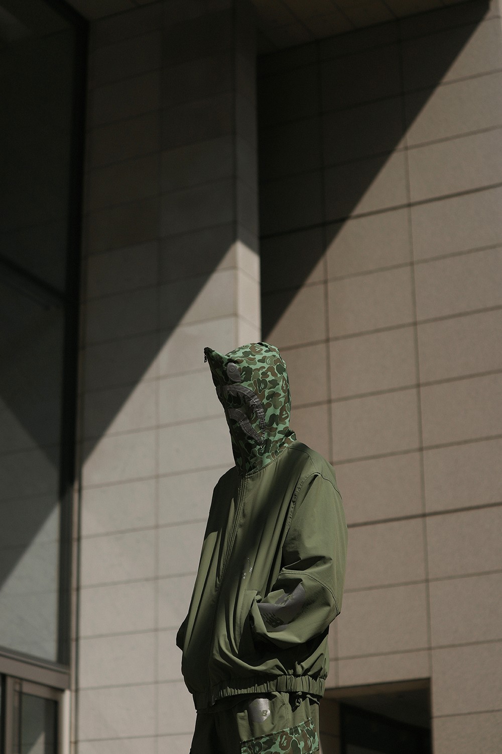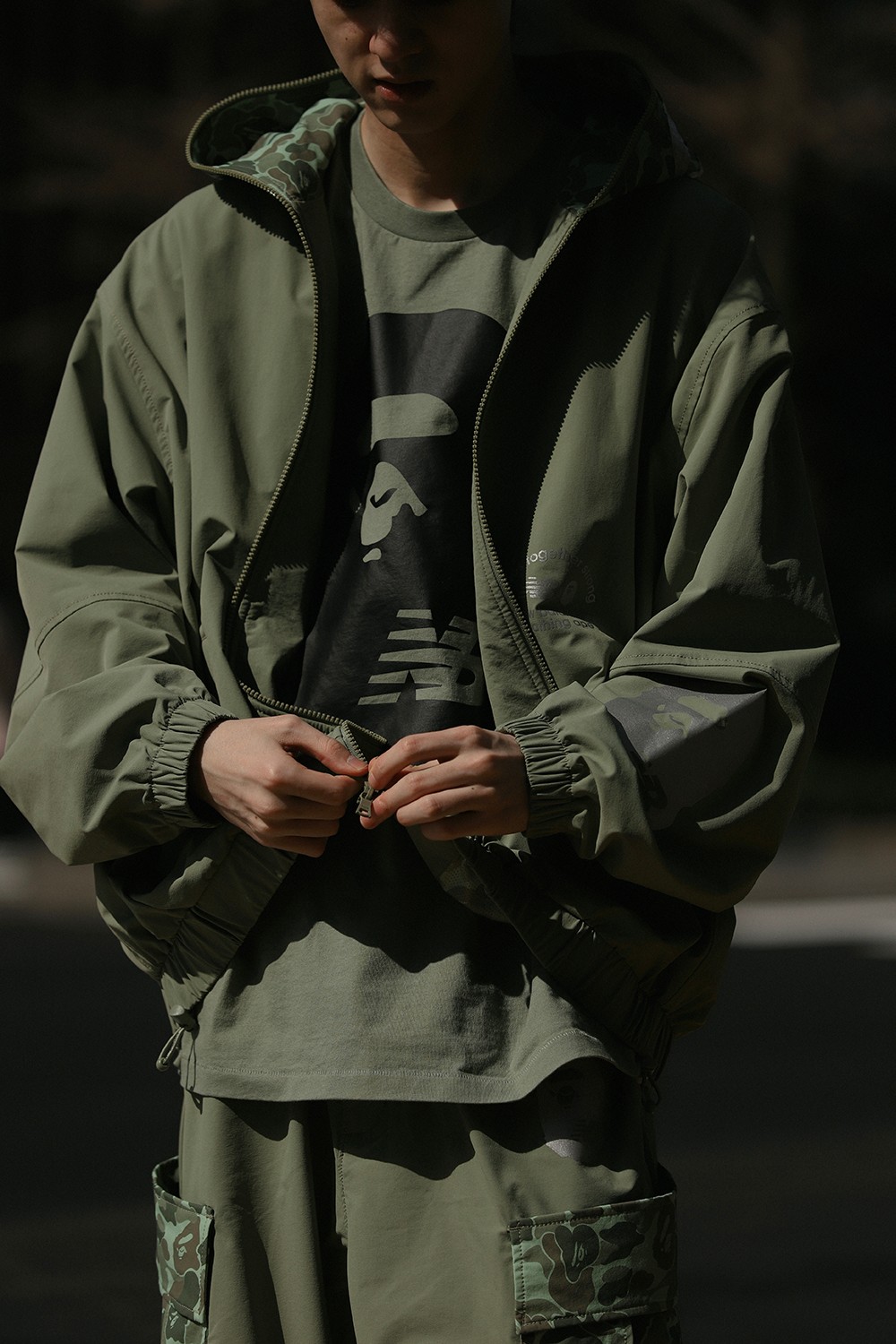 经典 BAPE 军装风设计灵感融入 New Balance 运动元素,不同色调的印花呈现在衣帽和裤兜等细节处。