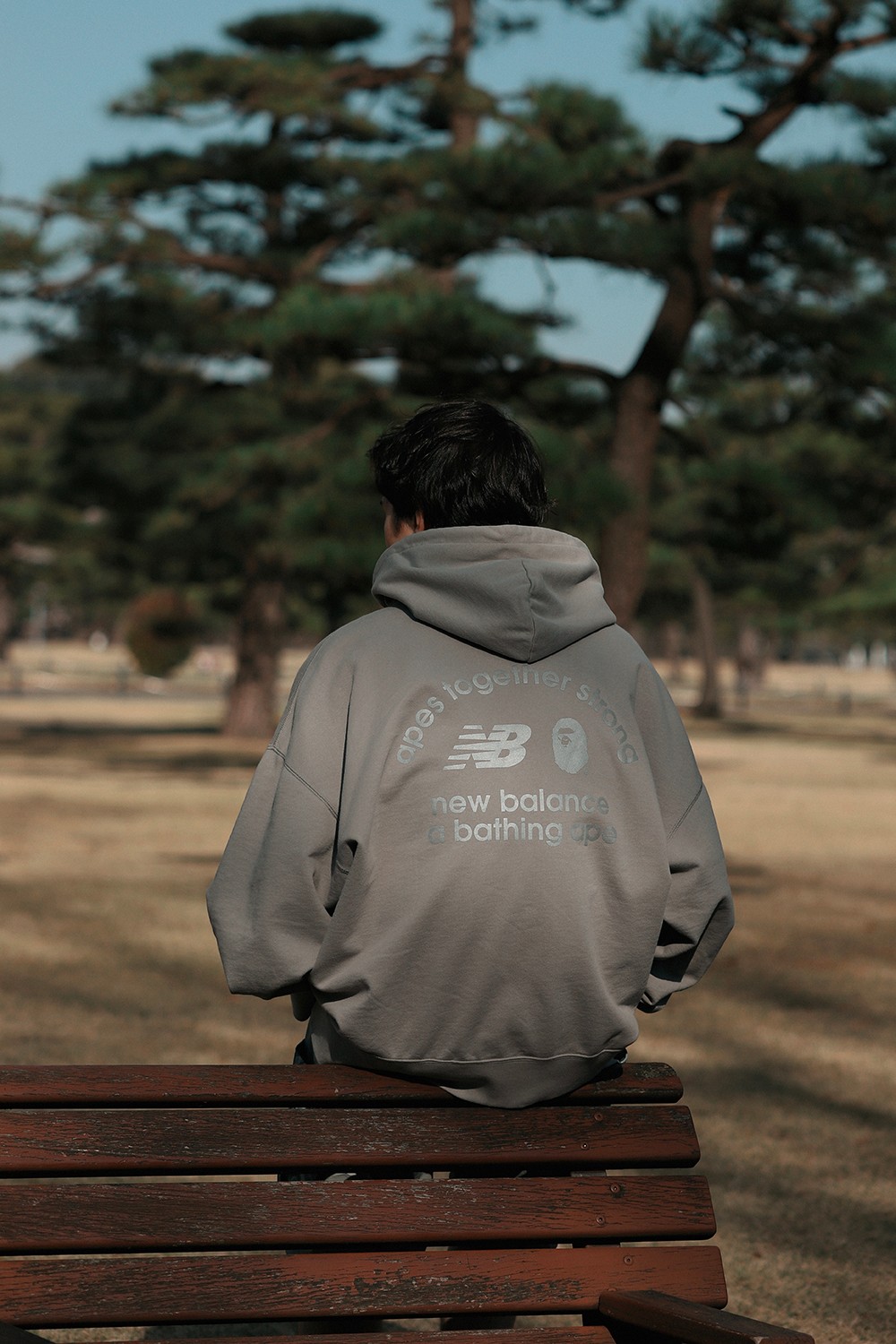 连帽夹克配以 BAPE 经典「SHARK HOODIE」鲨鱼帽衫元素带来强烈街头视觉体验,3M 反光材质的经典 BAPE 猿人头标志与 New Balance 品牌 Logo 以各种方式贯穿各列单品上,吸睛又百搭。