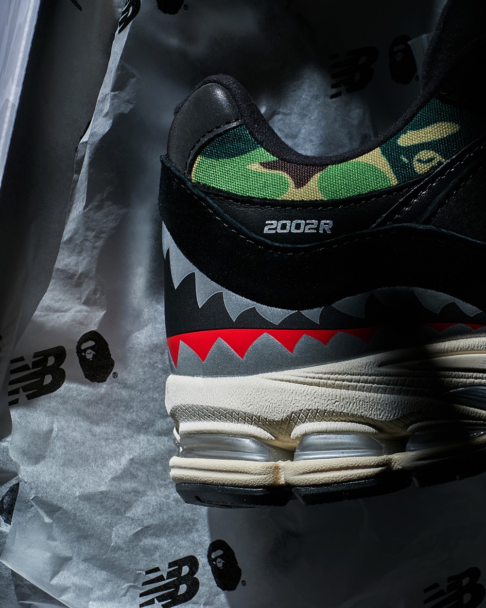 全新 BAPE x New Balance 2002R 一共带来两款配色,一个是清爽的灰色打底,另一个则是沉稳的黑色以绿色迷彩加持。