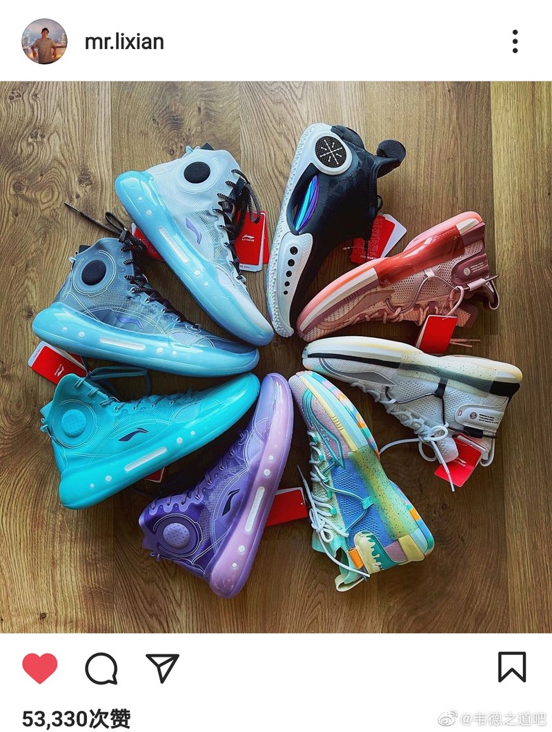 这已经不是李现第一次晒鞋,之前他就曾在 Instagram 上晒出李宁菊花阵,4 双驭帅 14 䨻 + 三双闪击 6 + 韦德之道 9「初生」。