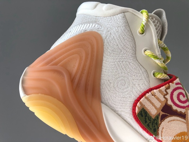 最大的亮点莫过于鞋面上 KT6 标志性的超大魔术贴,此次采用刺绣手法,将汤面中的配料附着其上,令人垂涎。