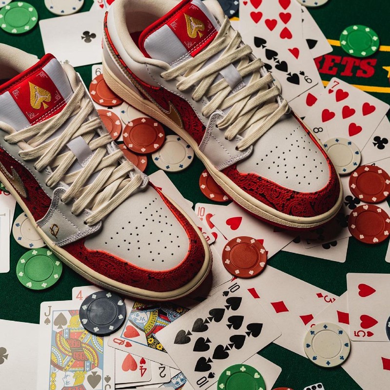 整体可谓奢华感十足,鞋头及鞋侧采用红色腰果花呈现,Swoosh 则以亮金色点缀,白色皮革上绣有金色 “K” 和 “Q” 的字样,如果 Jordan 算 “J” 的话,三张大牌已经凑齐。